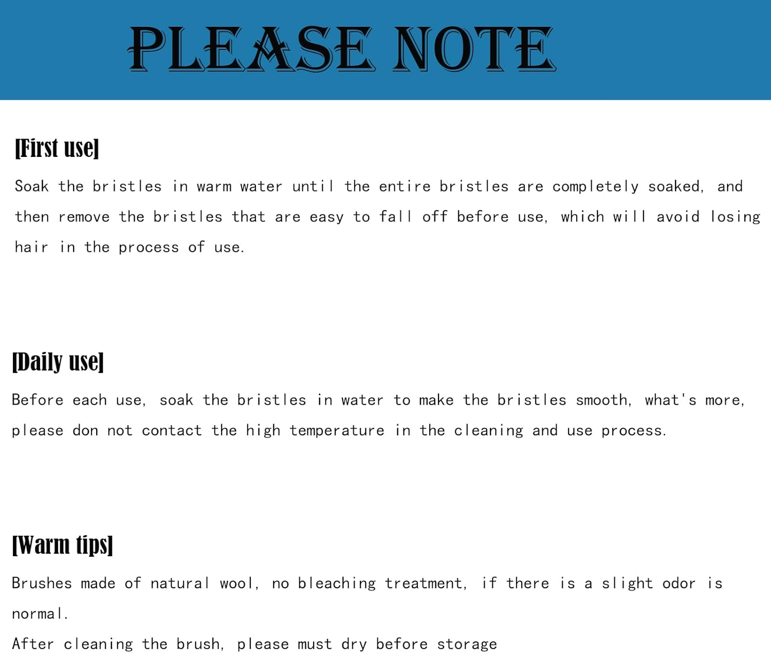 - [Easy to clean] Construction and material makes it easy to come apart. But better for cleaning after use. Please hang it in a shady and cool place to dry after cleaning. After drying, please put into the attached storage bag to extend the lifespan of the brush.