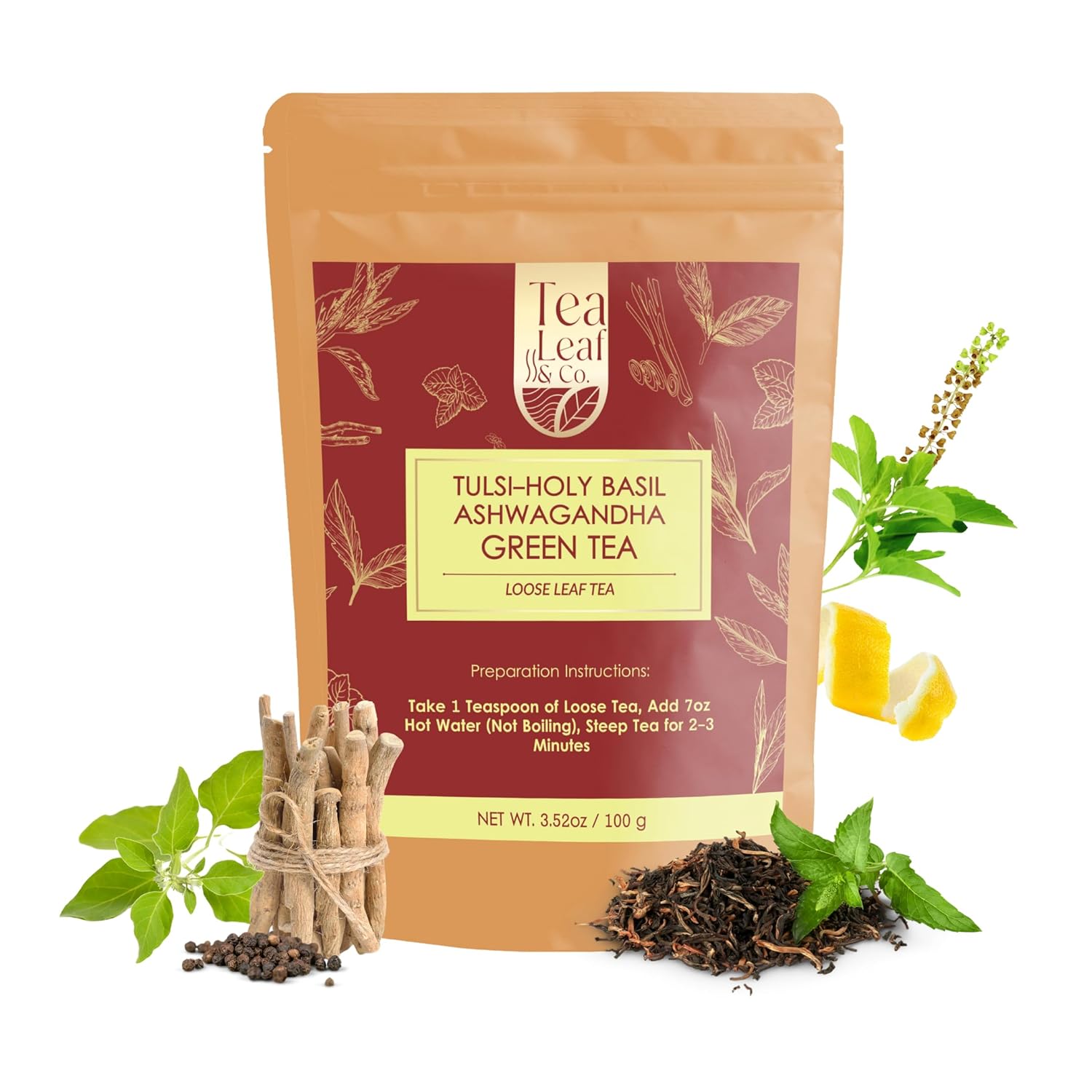 - Tea Leaf & Co. Tulsi Ashwagandha Green Tea: A premium blend of green tea, ashwagandha, tulsi, and peppermint in 100 gm loose leaves. Take advantage of a low-caffeine cup of tea that will delight your senses and make you feel refreshed.