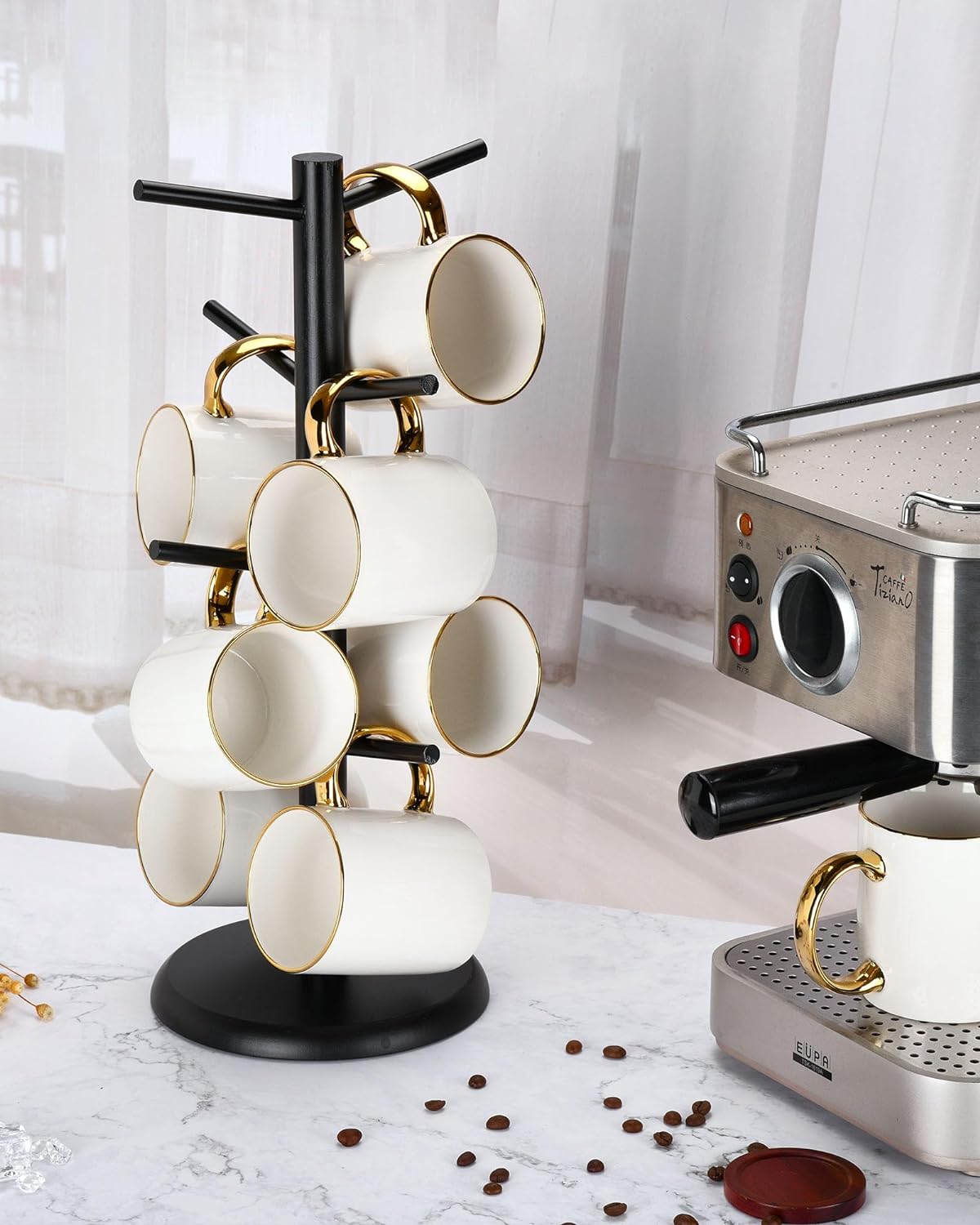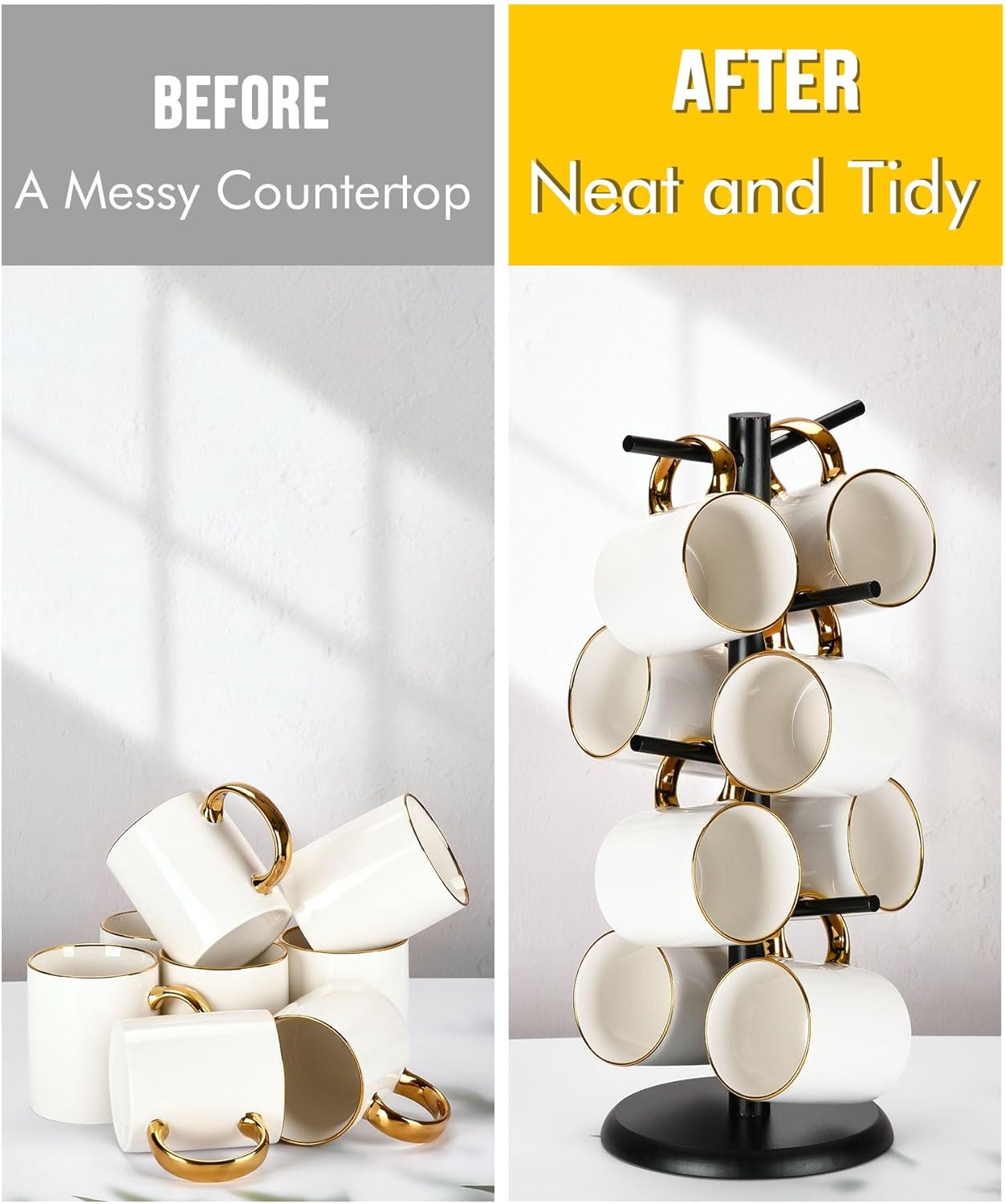 - Large Capacity & Saving Space: This Mug tree stand holds up 8 coffee mugs at a time and easy access, conveniently organize your cups and the storage of the kitchen. Saving room for your kitchen and making your kitchen looks more neater