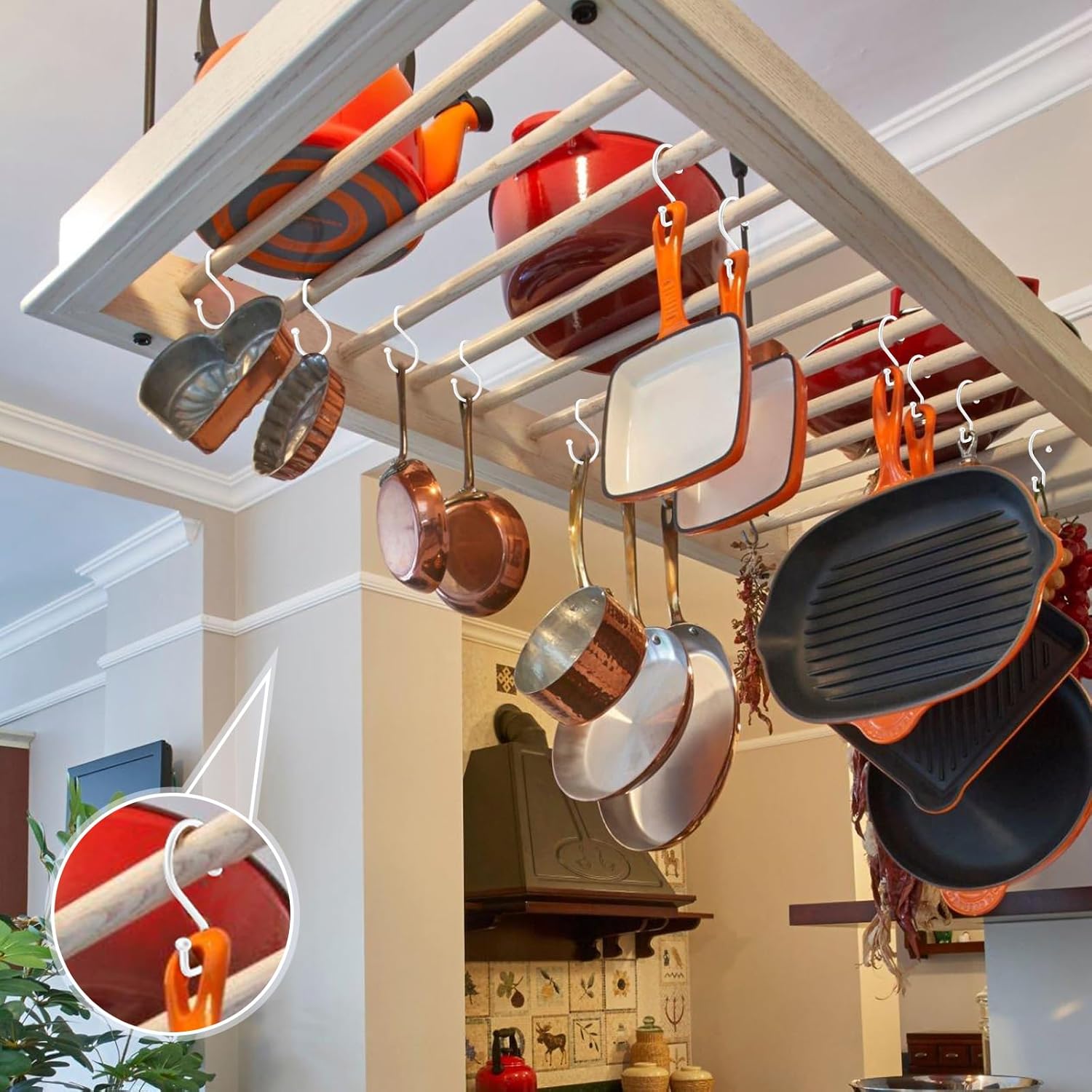 - Versatile Hooks: S shaped hooks holds well for pots and pans, oven mitts, mugs, towels, curtains, pants, caps, tools, crafts, plants, baskets, wreaths, garlands; can be used around the house like pantry, kitchen, bathroom, laundry, garden, garage, camper, RV, trellis, fence, gutter, deck; functional storage hooks with many uses, really serve its purpose