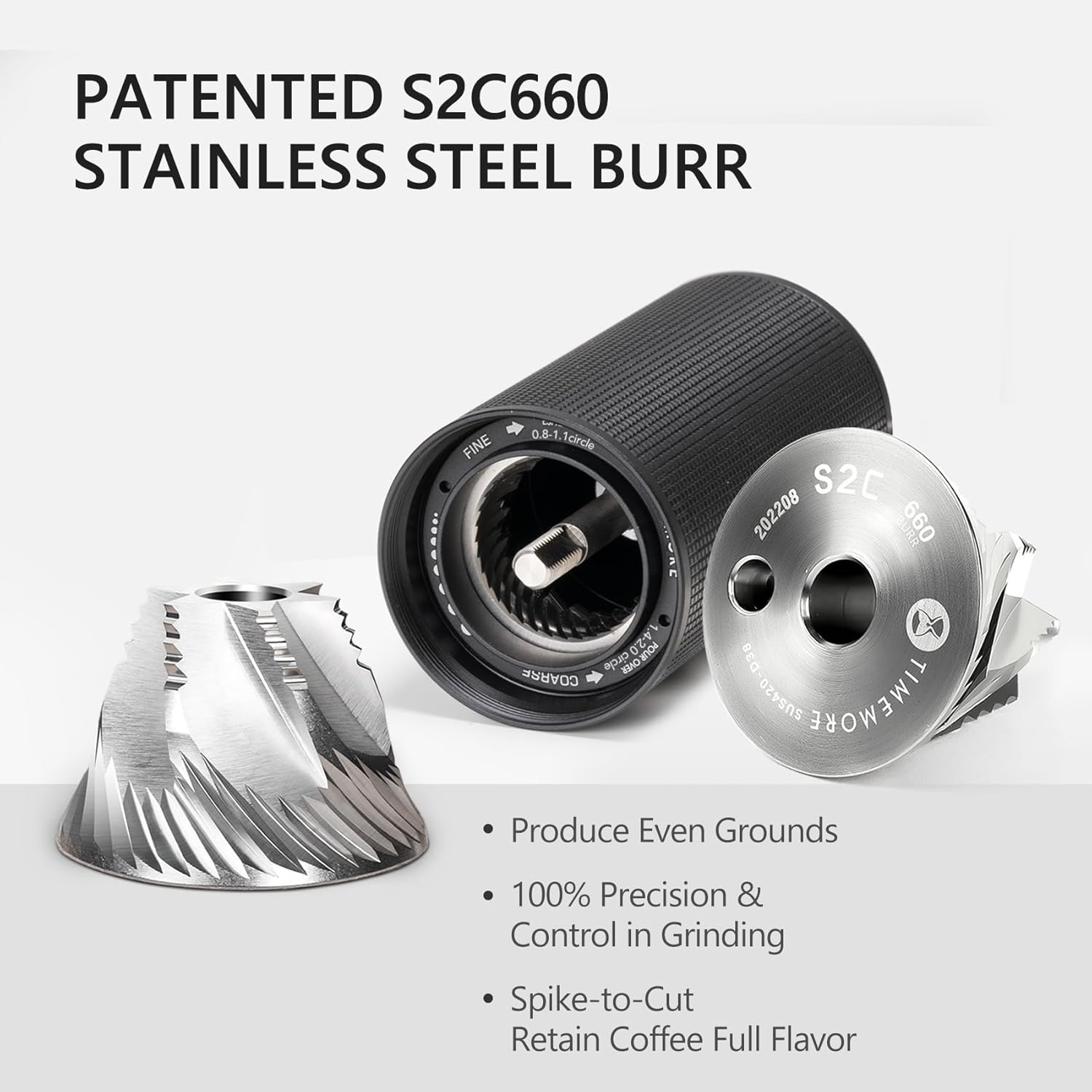 - [ What is C3 ESP? Special Design For Espresso ] Equipped with patented S2C660 stainless steel burrs with higher precision and efficiency. C3 ESP hand coffee grinder provides more precise grinding adjustment, minor adjustment of 0.0233mm per click allows you to easily achieve the perfect coarseness for your preferred fine to coarse. From French press to espresso coffee, TIMEMORE has you covered
