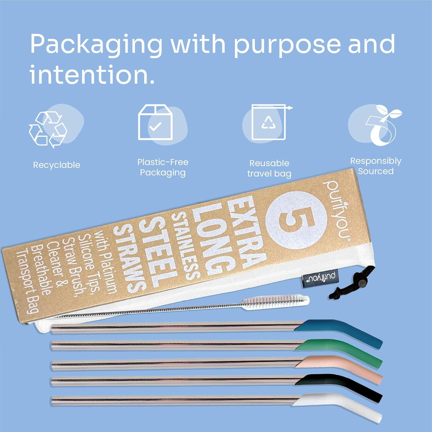 purifyou 14.5" Extra Long Stainless Steel Drinking Straws with Silicone Tips, Reusable Metal Straws for Tumblers, Smoothies, Milkshakes (Set of 5 with Brush)