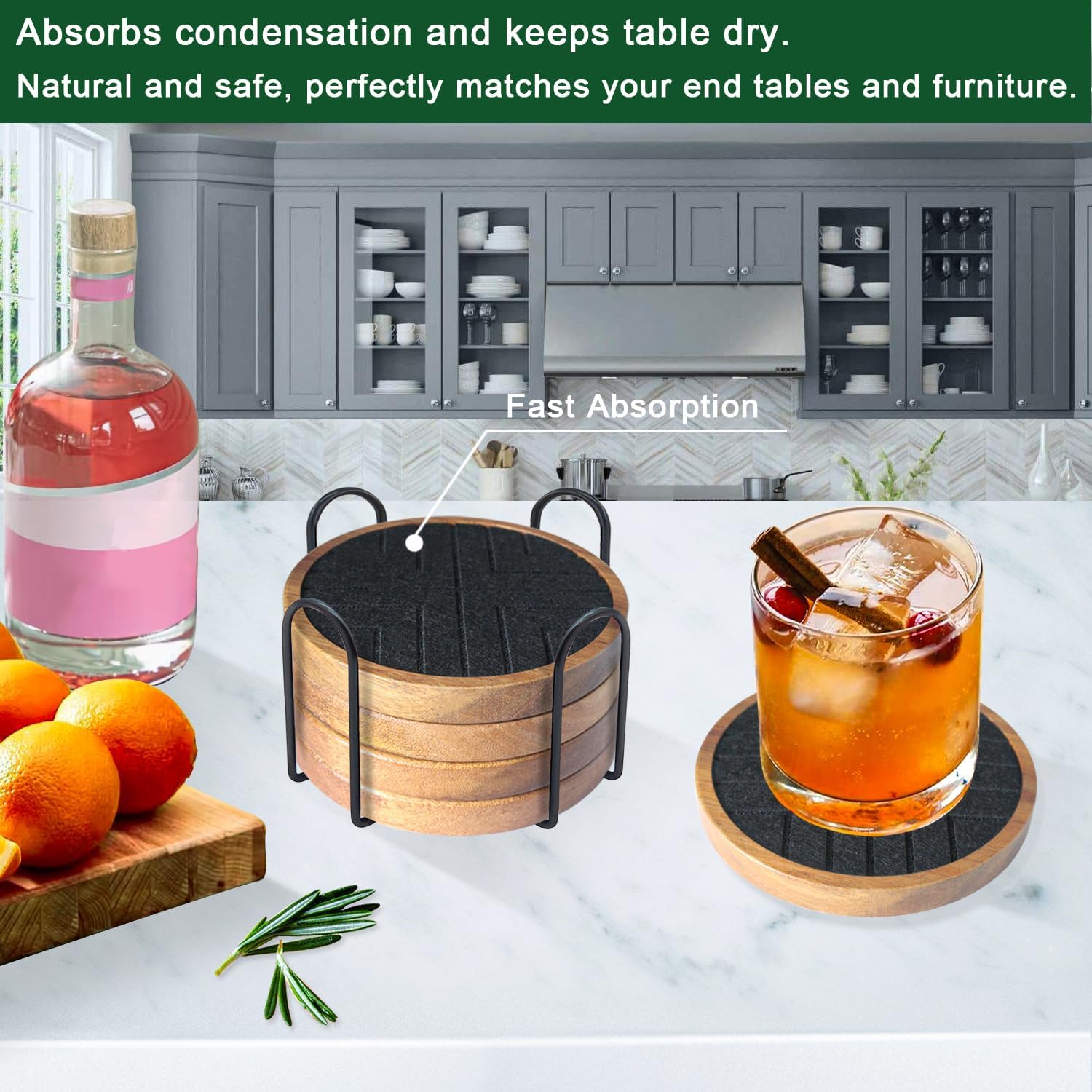 - 🍻Absorbent Coasters with Holder: Wood coasters with built-in thickened felt pads for stronger water absorption and heat insulation, capture liquids quickly were prevented any spills, keeping your tabletop clean and tidy, with no stains and water rings; extra large size easily accommodates cups of all sizes.