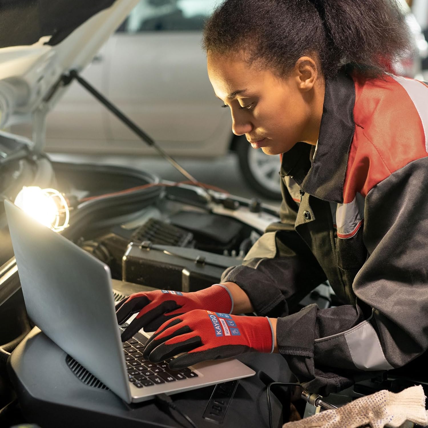 KAYGO Safety Work Gloves PU Coated for Men and Women- KG11P,12 Pairs,Seamless Knit Glove with Two Fingers Touchscreen,Ideal for General Duty Work (Red,S)