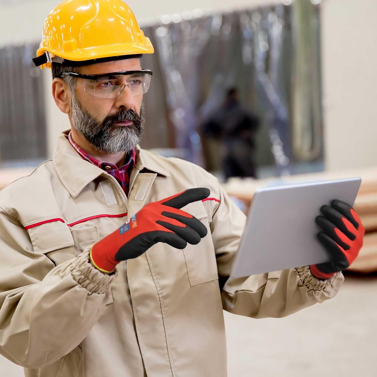 KAYGO Safety Work Gloves PU Coated for Men and Women- KG11P,12 Pairs,Seamless Knit Glove with Two Fingers Touchscreen,Ideal for General Duty Work (Red,L)