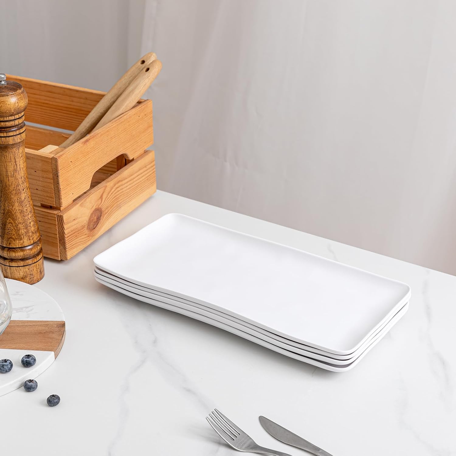 White Melamine Rectangular Serving Platter/Trays, Set of 4, 14” X 7” Fruit Cake Bread Sushi Plate for Party Serving Food, Lightweight and Unbreakable