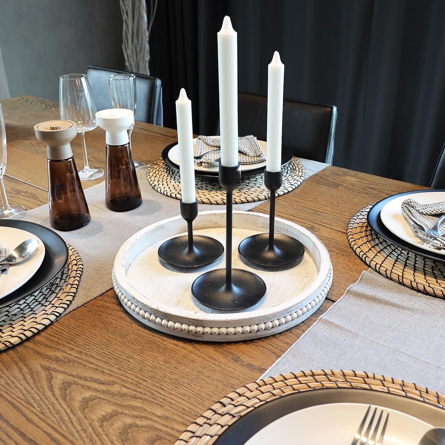 Round Wood Serving Tray with Beaded, 13” Rustic Wooden Decorative Coffee Table Tray for Centerpiece, Ottoman, Farmhouse Circle Trays for Counter, Living Room, Home Decor (Whitewashed)