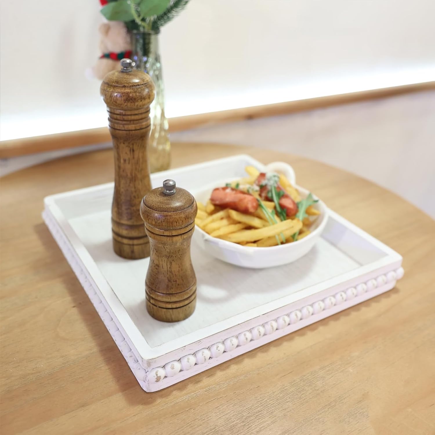 - Natural Elegance: Choose from a variety of shapes and colors, including round, rectangular, oval, square, washed white, retro brown, black, white, natural log color. Each decorative tray showcases unique wood grain patterns, adding a touch of natural beauty to your home decor.