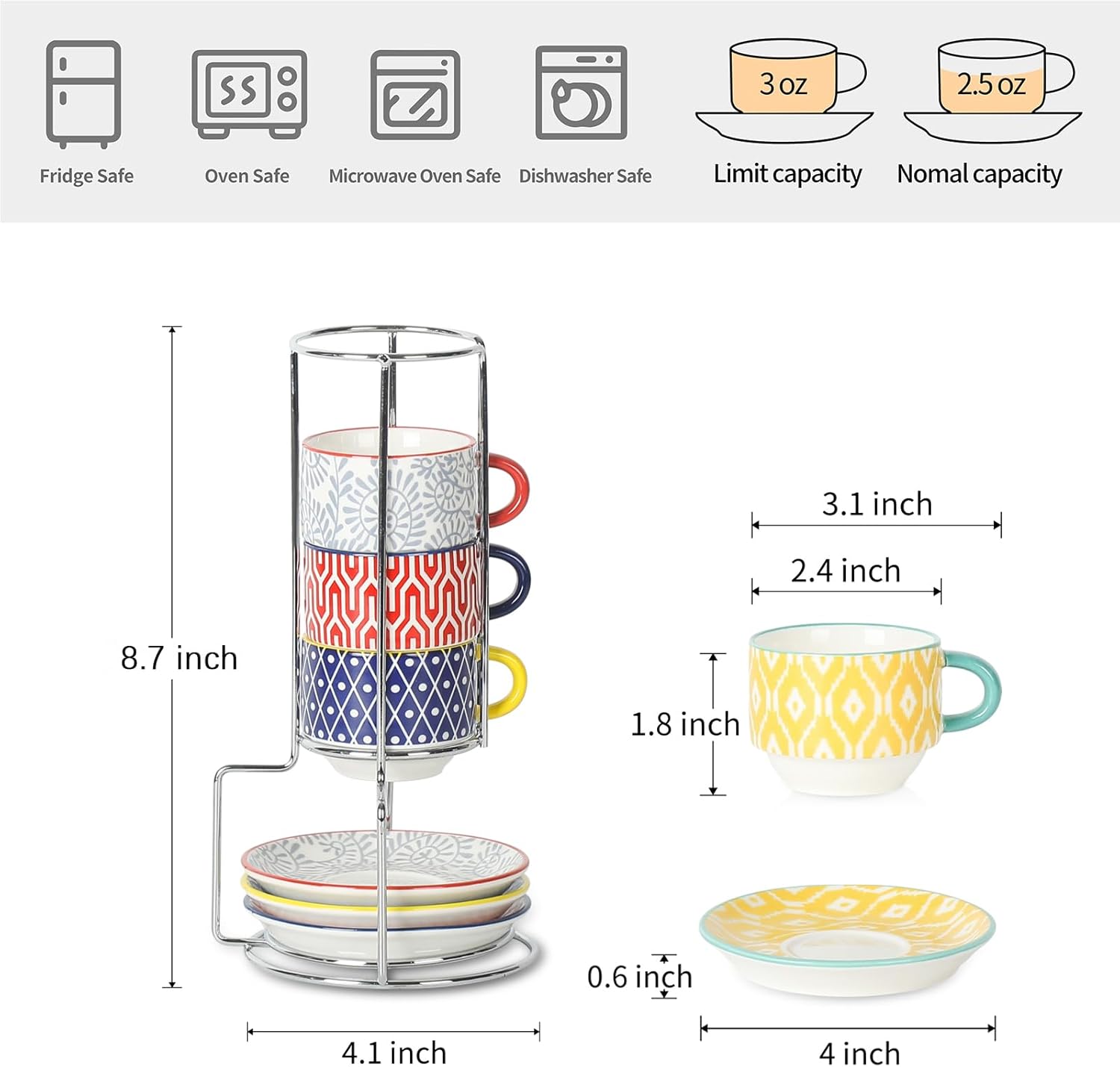 Selamica Ceramic Espresso Cups with Saucers and Metal Stand, 2.5 OZ Stackable Demitasse Cups for Espresso Latte Café Mocha Tea, Set of 4, Assorted Colors