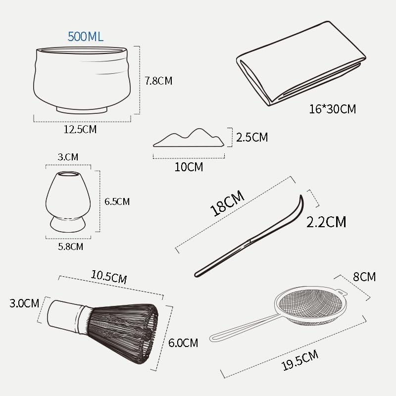 - ๐๐ก๐ ๐๐๐ซ๐๐๐๐ญ ๐๐๐ฉ๐๐ง๐๐ฌ๐ ๐๐๐ญ๐๐ก๐ ๐๐๐ ๐๐๐ญ :Embrace the essence of Japanese matcha experience with the perfect 7-piece matcha starter set.Contain:1*Ceramic Matcha Bowl 500 ml/17 oz, 1* Cermaic Whisk Stand(Chasen Holder), 1* Ceramic Scoop Stand, 1* Bamboo Whisk, 1* Bamboo Scoop (Chashaku),1* Cotton Tea Cloth, 1* Matcha Powder Sifter. Whether you're a matcha enthusiast or seeking to delve into the traditions of Japanese tea ceremony, this set caters to all your needs