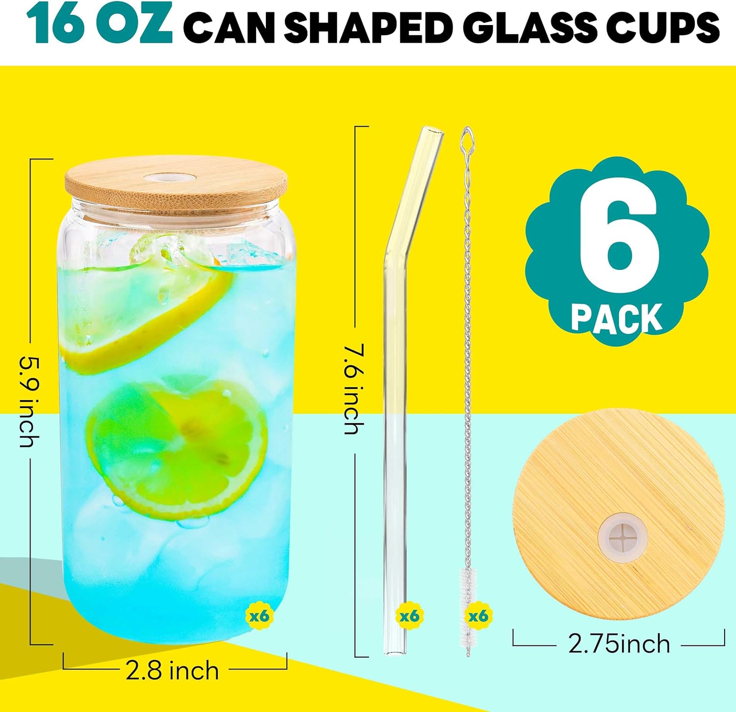 Joyclub Glass Cups with Bamboo Lids and Straws 6 Set 16 oz Reusable Iced Coffee Cup Beer Can Drinking Jars for Smoothie Whiskey Boba Soda Tea Gift