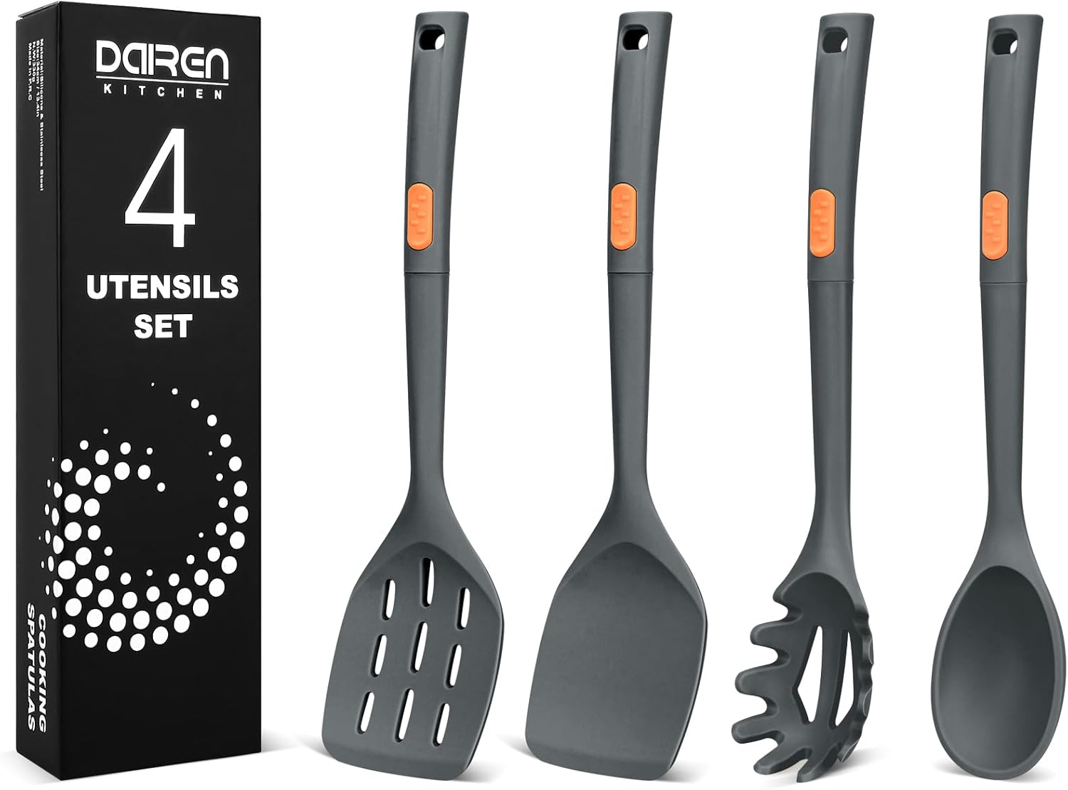 - Silicone Cooking Utensils Set: Pack of 4 large silicone cooking spatulas and spoons are nonstick, This kitchen utensils set includes a slotted spatula, a solid spatula, a solid spoon and a Pasta fork, ideal for frying, mixing, serving, draining, turning and stirring.