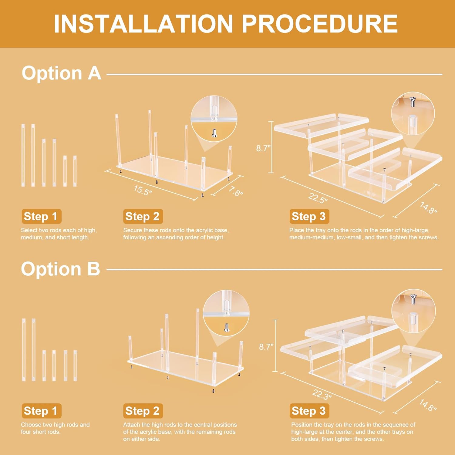 - [Effortless Installation] Our dessert stand is thoughtfully designed with an acrylic rectangular serving tray and sturdy struts. You can easily set it up within minutes by securely fastening the nuts onto the tray. The dimensions of the tiered serving tray are as follows: 14.8" x 8.3", 14.4" x 7.9", and 14" x 7.5"