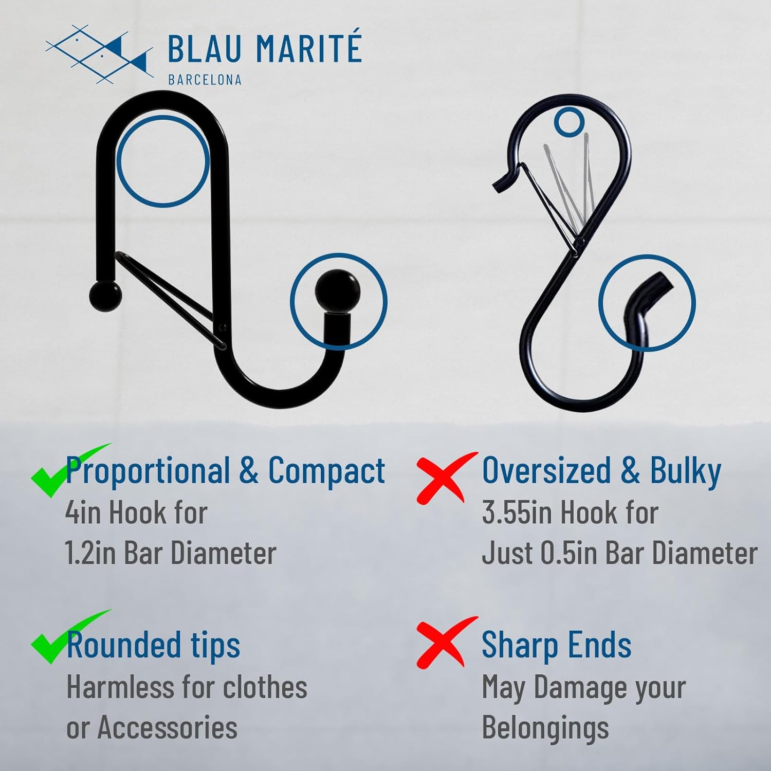 - ROUNDED EDGES: The end of the hooks have a small metal ball to protect clothes from snags and tears. It also acts as a stopper to prevent hanging objects from slipping and falling.
