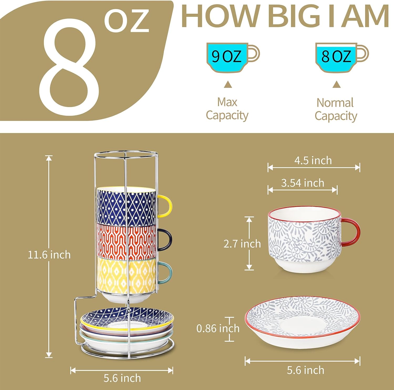 Selamica Ceramic Cappuccino Cups with Saucers and Metal Stand, 8 OZ Stackable Espresso Coffee Cups for Coffee, Latte, Americano, Tea, Set of 4, Assorted Colors