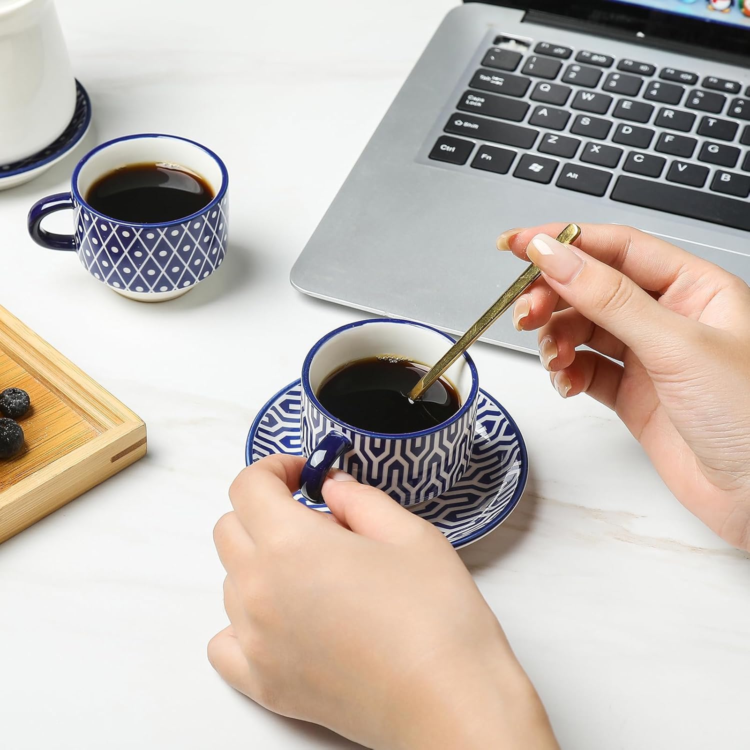 - DELICATE EXTERIOR DESIGN - Each small espresso cup with its matching saucer has unique patterns and bright colors, which look outstanding to display near your espresso machine! Using these delicate cups makes you cheerful and feels like you are in a cafe.