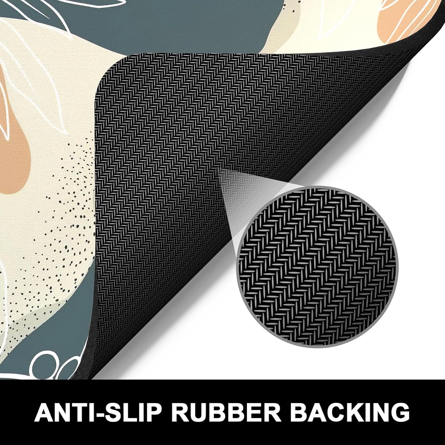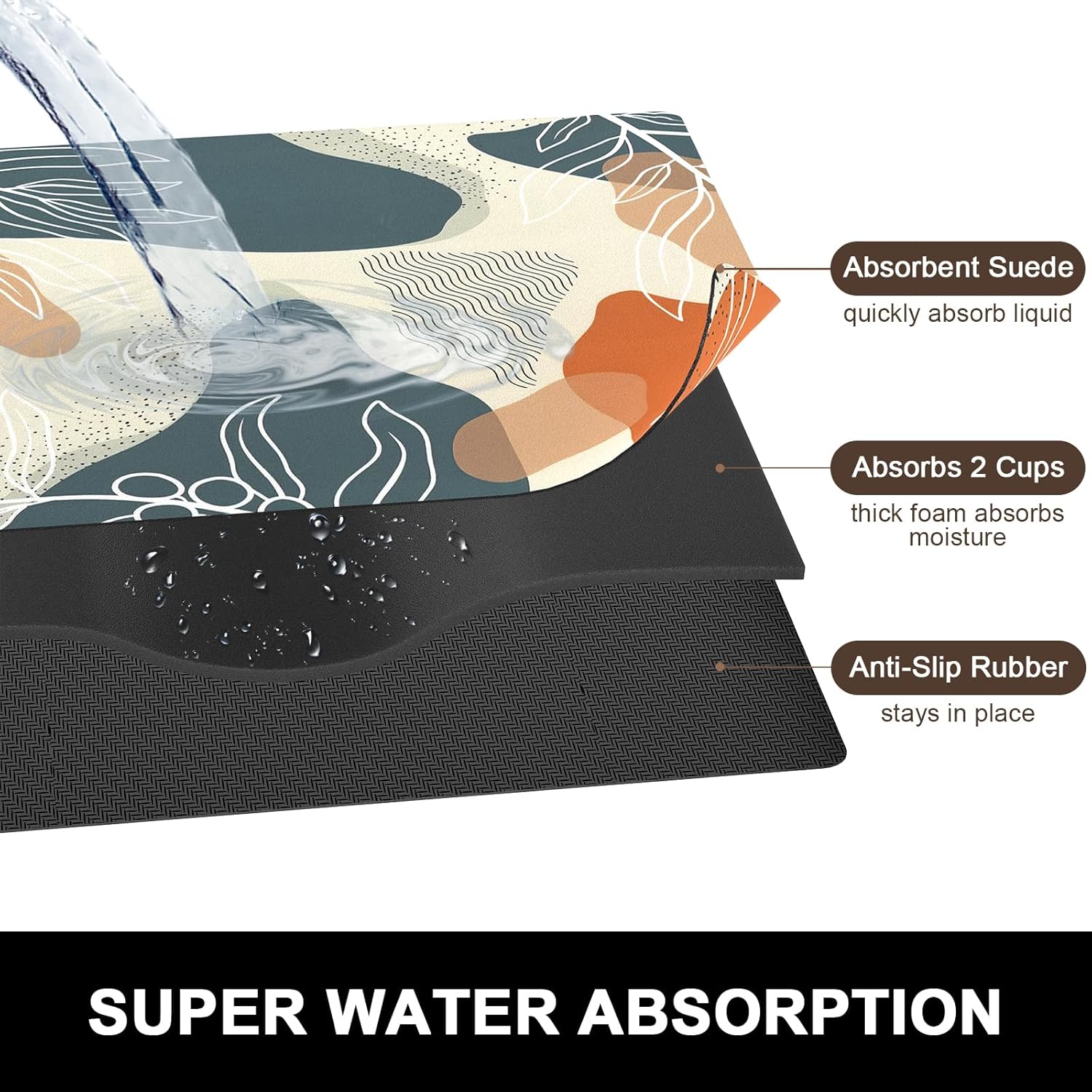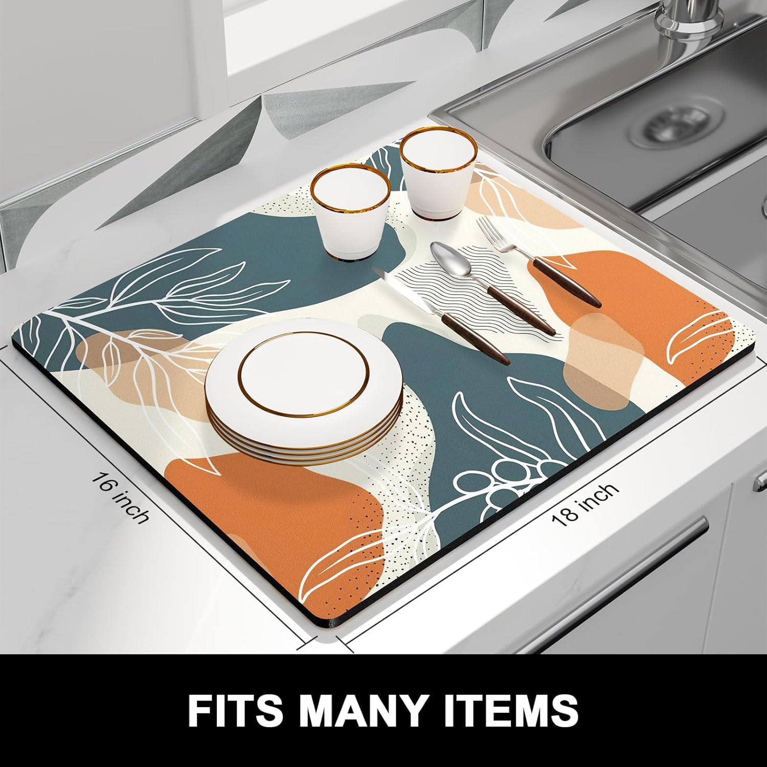 Rnivvi Dish Drying Mat for Kitchen Counter, 16 x 18" Cute Boho Theme Absorbent Heat Resistant Drying Pad with Non-slip Rubber, Coffee Bar Mats for Coffee Machine Dish Rack, Abstract Leaves