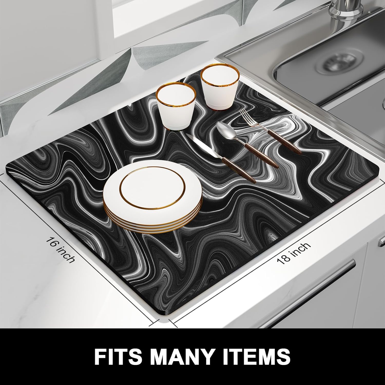 - Protect Tableware: Kitchen drying mats measure 16 x 18 inch. Fit most kitchen countertop space. 0.12 inch thick to protects your counter from scuffs and scratches while also keeping your most prized glassware safe and sound