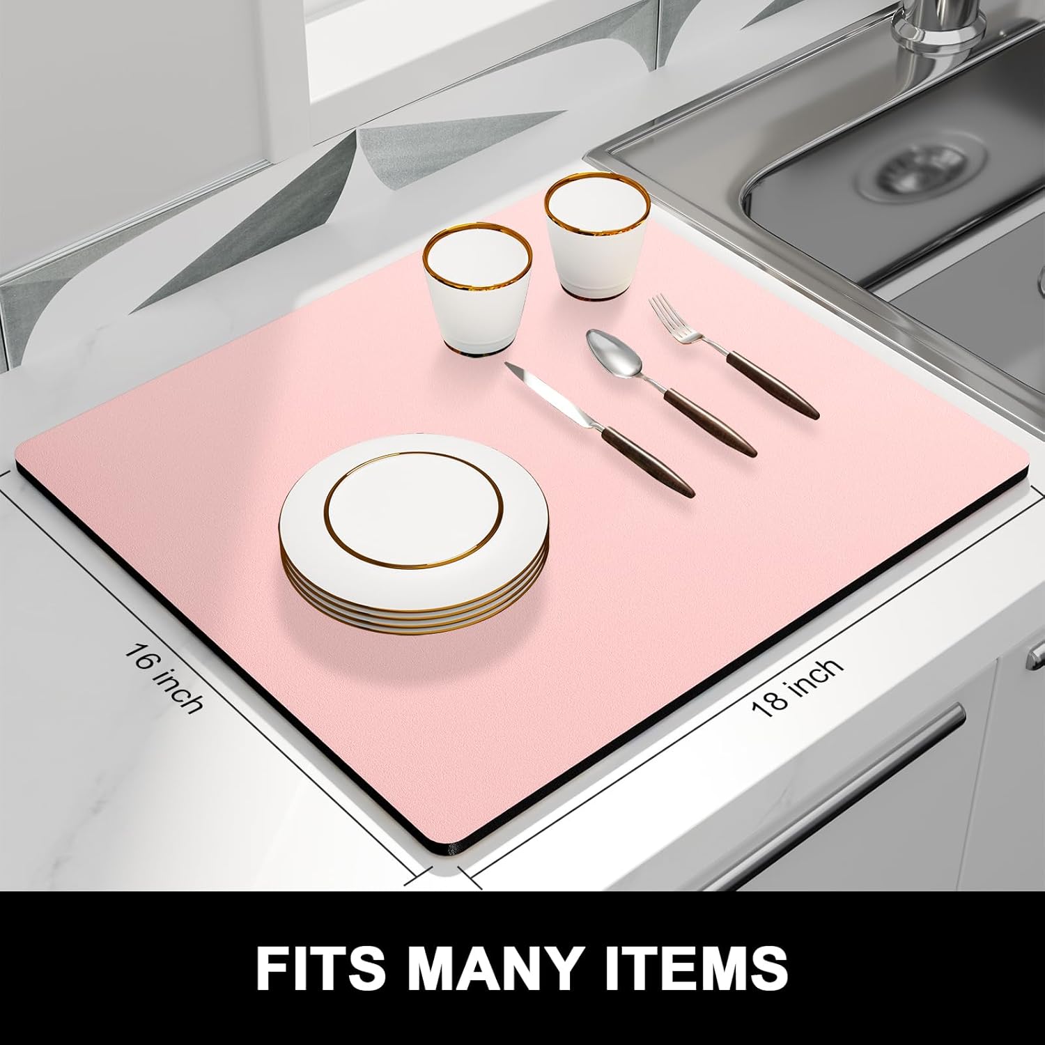 Rnivvi Dish Drying Mat for Kitchen Counter, 16 x 18" Cute Absorbent Heat Resistant Drying Pad with Non-slip Rubber, Coffee Bar Mats for Coffee Machine Dish Rack Kitchen Decor Accessories, Pink