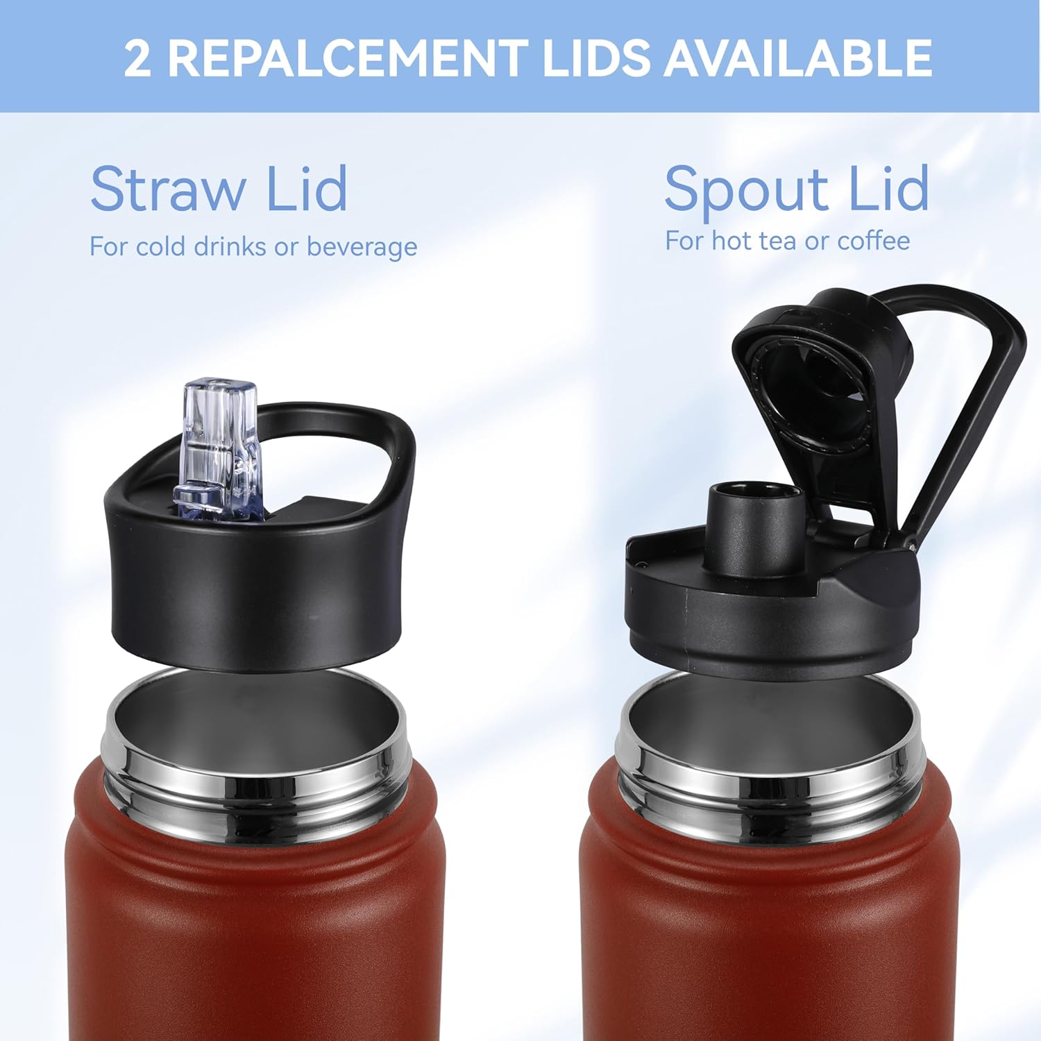 - 【Spout Lid & Straw Lid】 This water bottle comes with 2 lids: an innovative leak-proof spout lid and a newly improved straw lid that has been enhanced for better flow. Easily fill your water bottle with ice and clean it through the wide mouth opening. Both allow easy one-handed or hands free sipping, they are designed for you to drink anytime, anywhere.