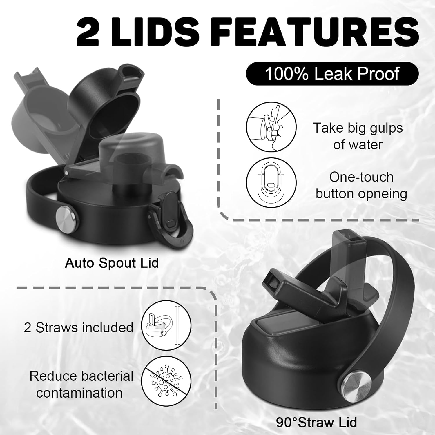 - 【VERSATILE FOR ANY OCCASION】ABOTOCUP insulated water bottle provide a different drinking experience with two lids that are fully leak-proof and designed for effortless drinking. Water bottle with handle perfect for any indoor and outdoor activities. Come with ergonomic handle and Paracord handle with compass, safety ring that built for the toughest.