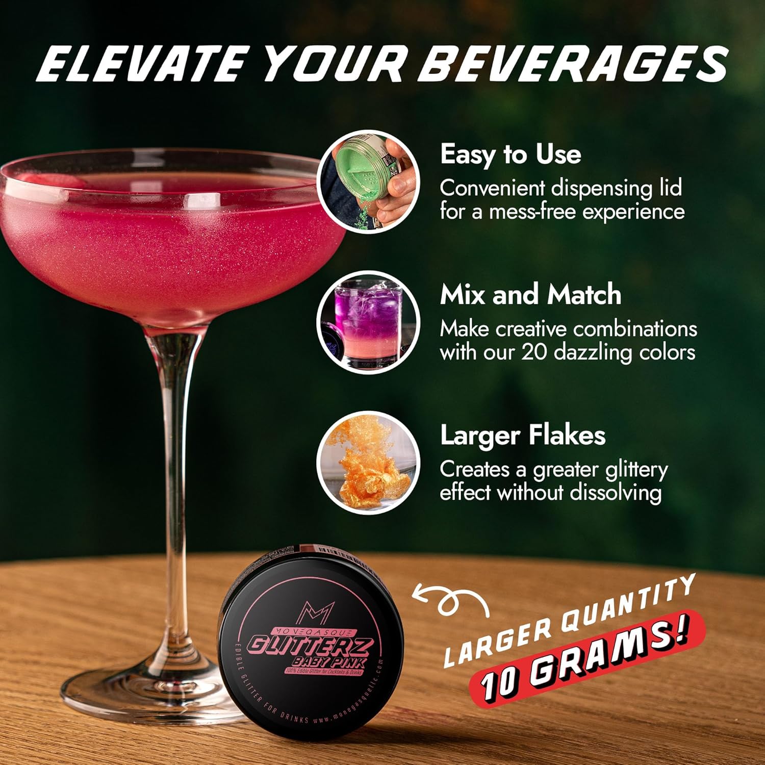 - PREMIUM EDIBLE GLITTER FOR COCKTAILS – Add a touch of glamour to your creations with MONÉGASQUE Glitterz. Perfect for cocktails, cakes, and more, our halloween glitter is flavorless and safe, crafted from mica-based pearlescent and food-grade colorants.