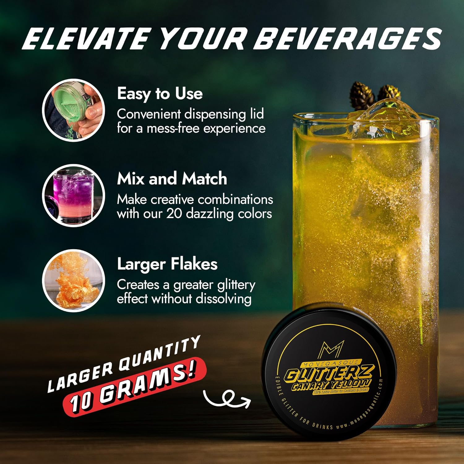 MONÉGASQUE Canary Yellow Edible Glitter for Drinks 10g – Yellow Edible Glitter for Cakes & Cocktails – Halloween Cocktail Drink Shimmer Flakes - Food Decorating & Cake Decorations Spray Dust