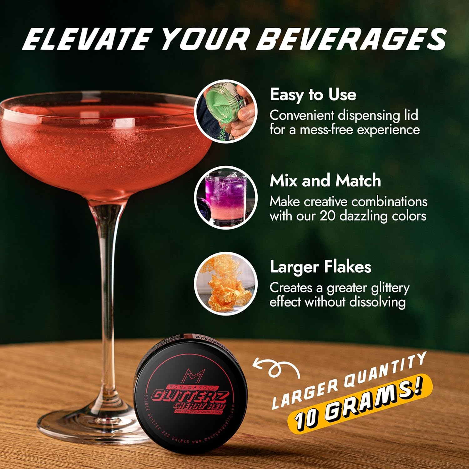 - PREMIUM EDIBLE GLITTER FOR COCKTAILS – Add a touch of glamour to your creations with MONÉGASQUE Glitterz. Perfect for cocktails, cakes, and more, our halloween glitter is flavorless and safe, crafted from mica-based pearlescent and food-grade colorants.