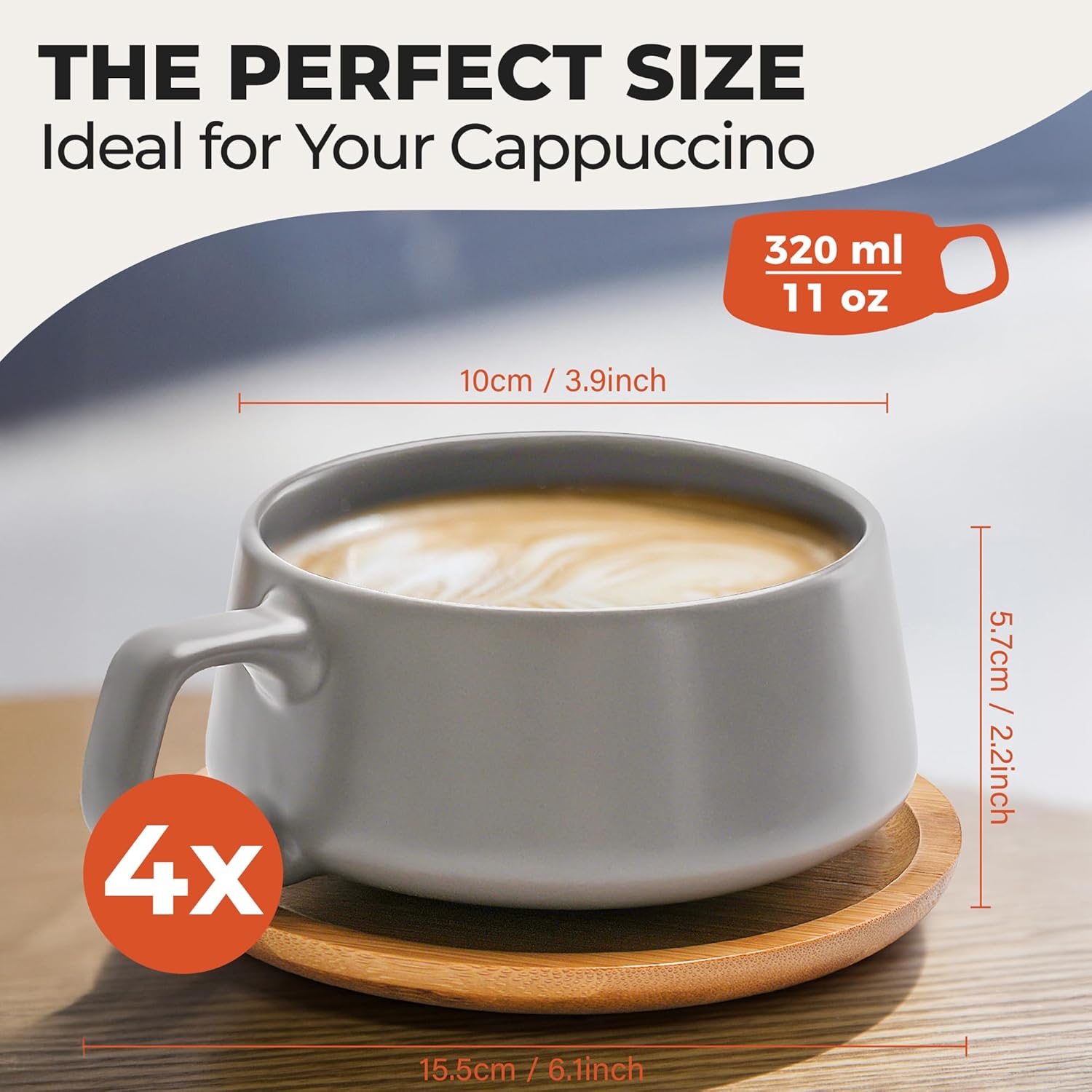 - πππ ππππ πππ ππππ - Coffee mug set consists of 4 great coffee pots with wooden saucer. With a capacity of 11 Ounces, a diameter of 3.9 Inches and a height of 2.2 Inches, the coffee cups are ideal for your favorite hot drinks. Whether it's coffee, latte macchiato, cappuccino, espresso or tea, these cups / glasses are big enough for all your favorite drinks.