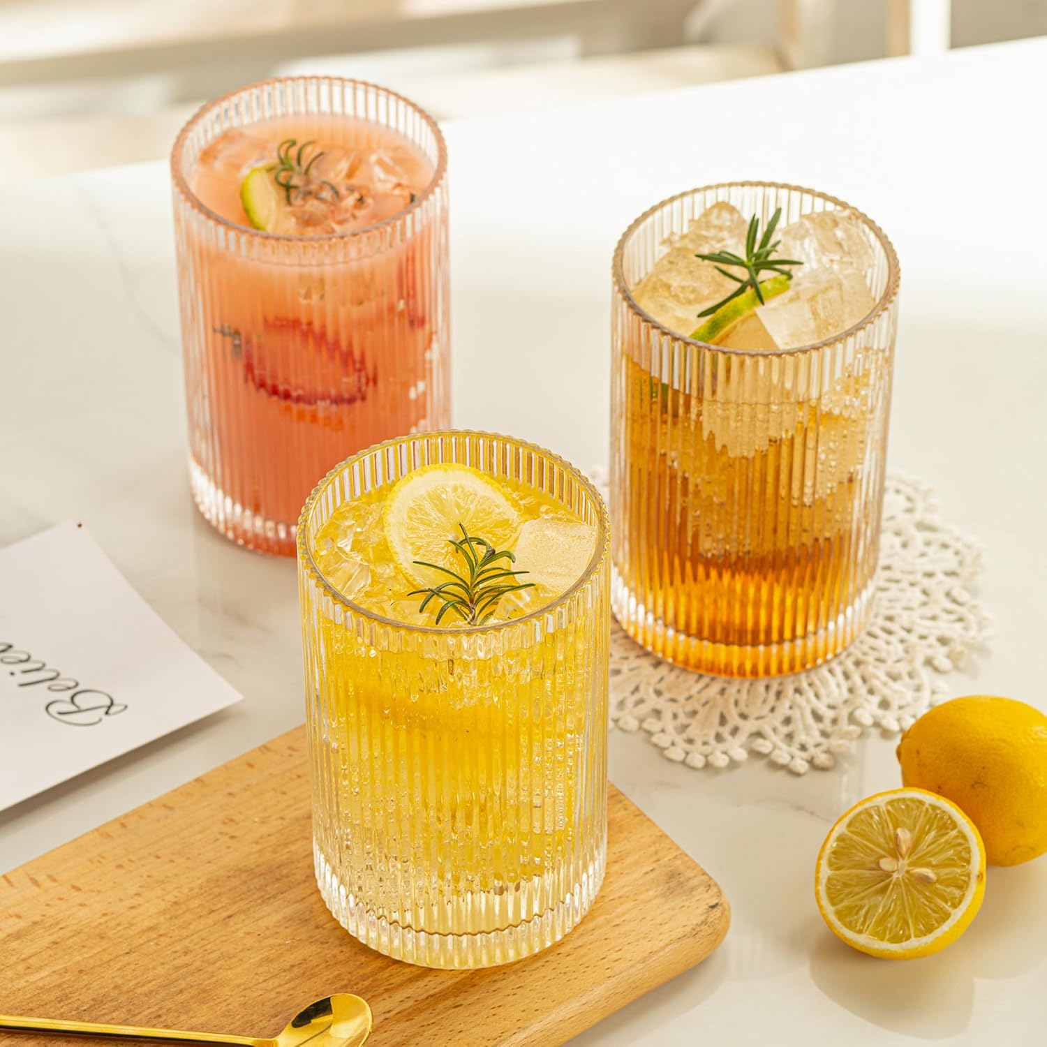 Vintage Ribbed Glassware Set: 6pcs 16.9oz XL Drinking Glasses, Fluted Ripple Drinkware, Origami Style, Elegant Glassware for Whiskey, Cocktail, Iced Coffee, Juice, Beer, Soda