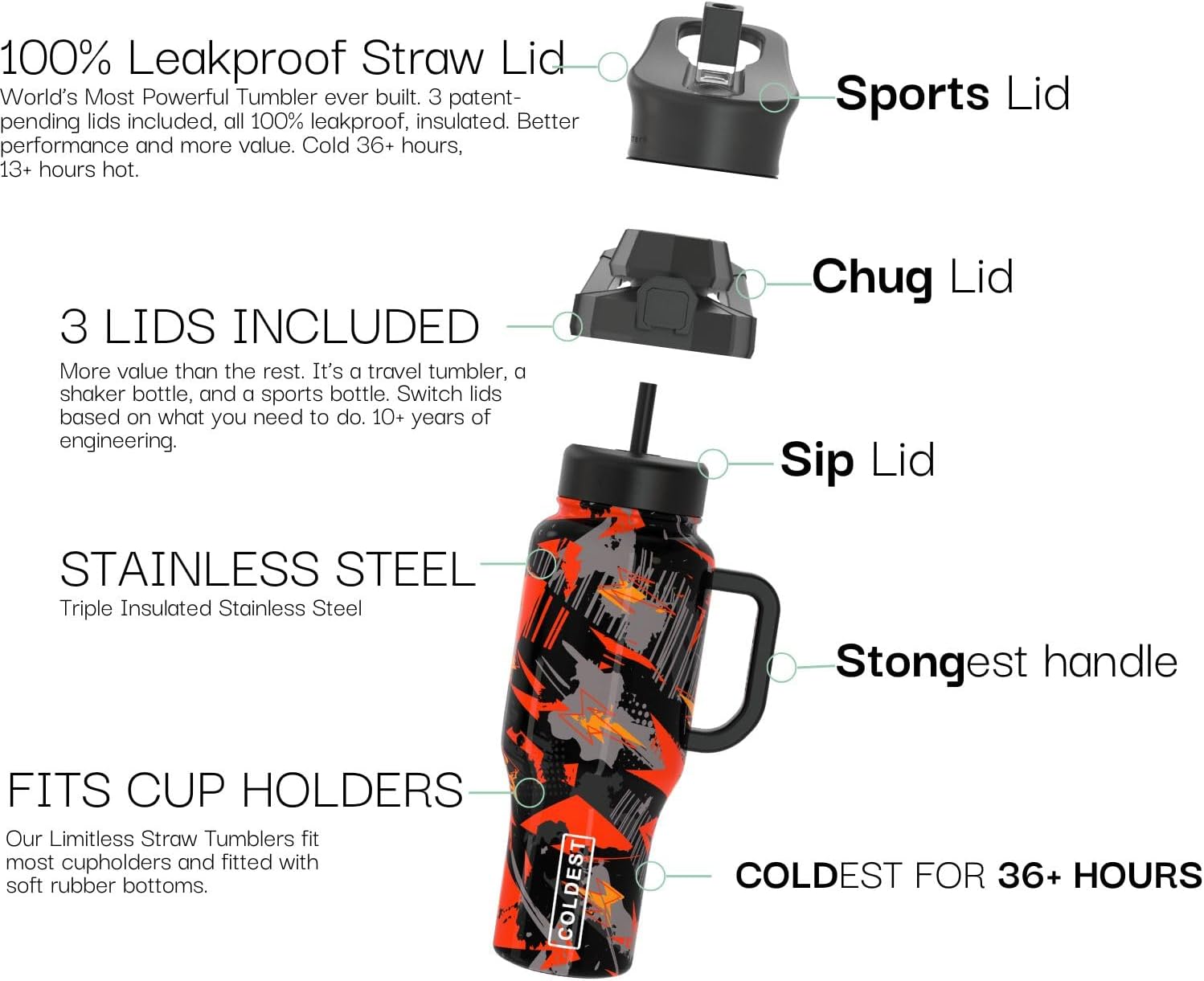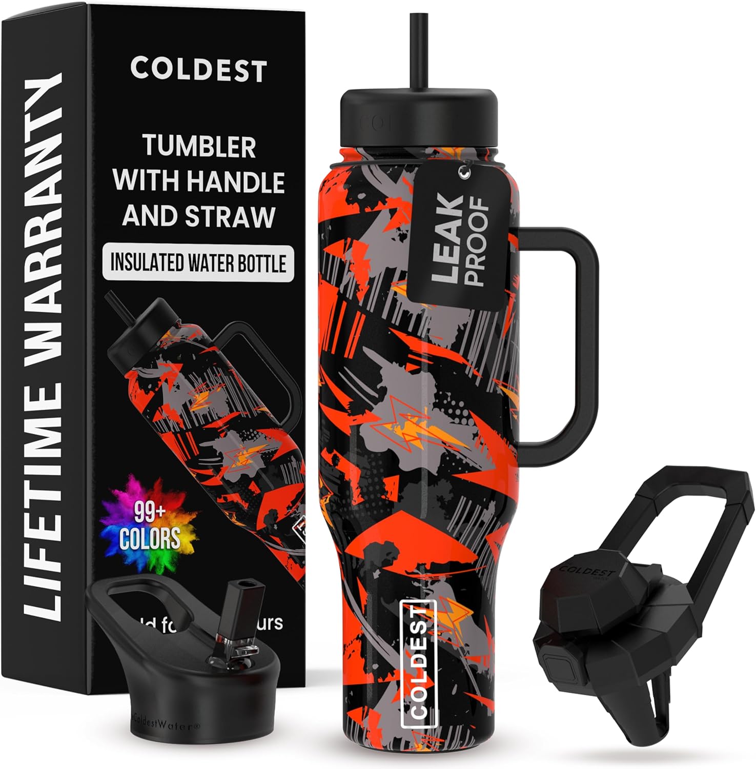 - 100% Leak-Proof, Guaranteed: No more worrying about spills- Coldest water bottle with handle is engineered for a completely leak-resistant experience. With three versatile lids, including a straw option, you can confidently take your drink anywhere without a single drop escaping.