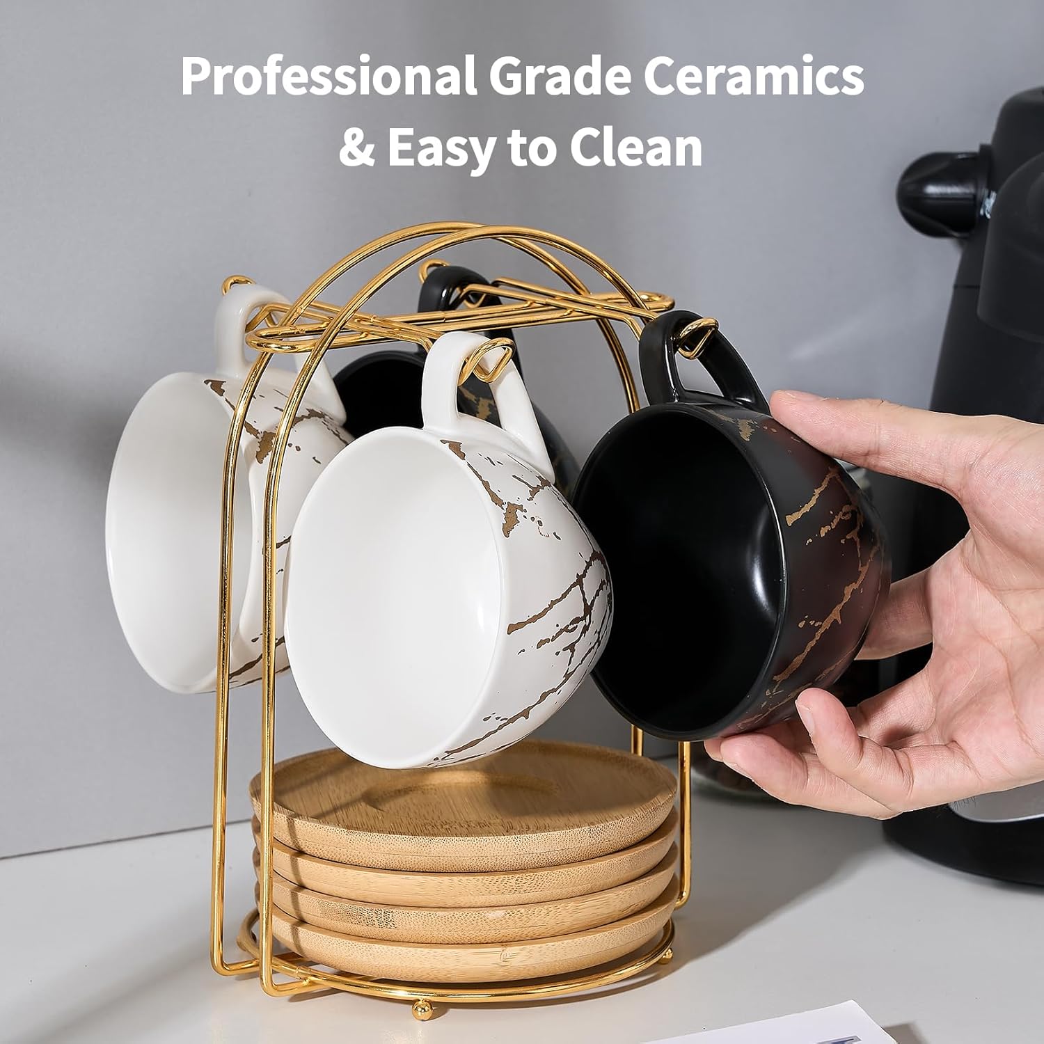 LUKA Ceramic Demitasse Espresso Cups Set with Saucers and Metal Stand, 8 oz Porcelain Stackable Cappuccino Cups Teacup For Tea, Espresso, Latte, Coffee, Cafe Mocha, Set of 4, White & Black