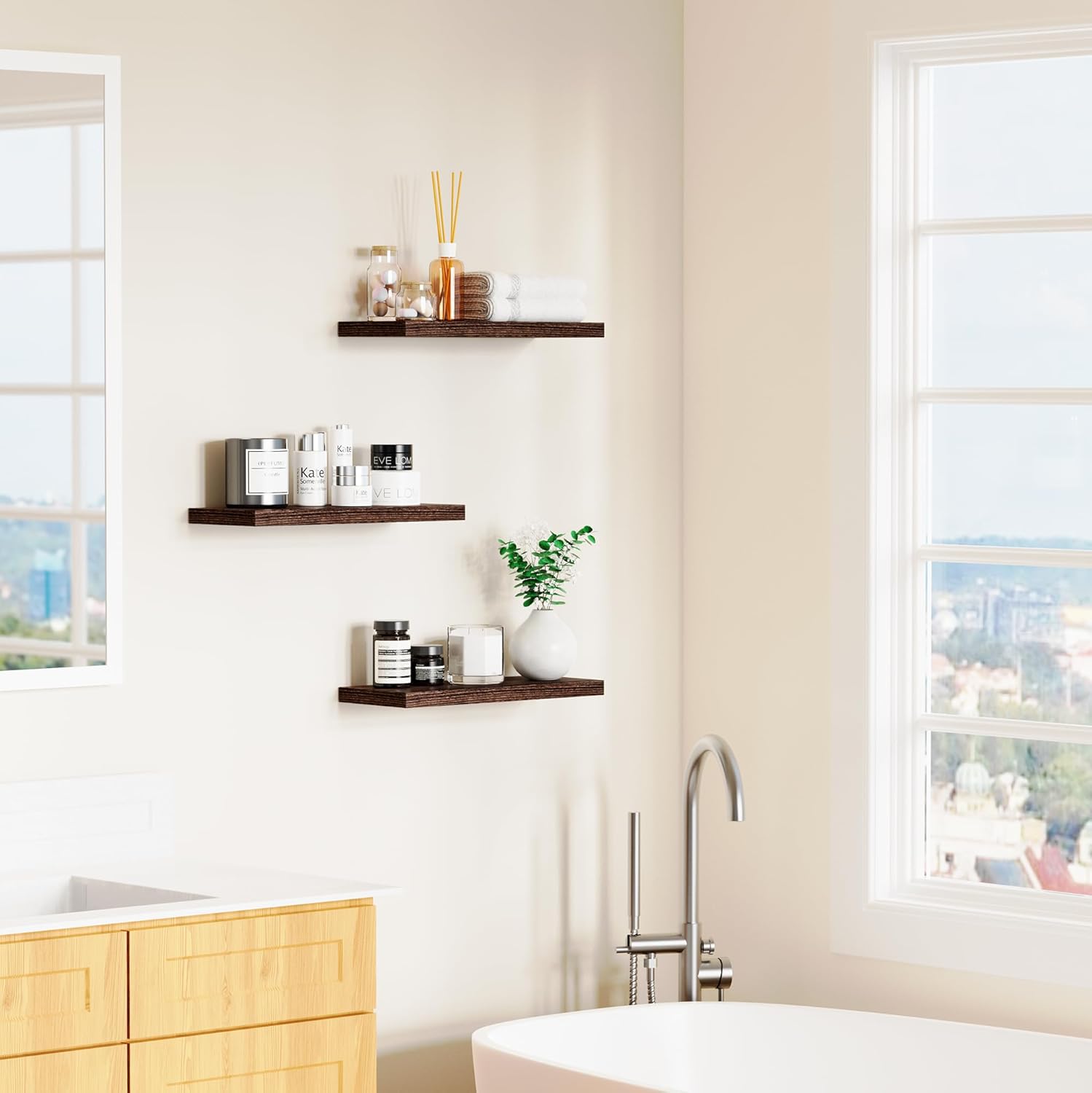 3 Pack Floating Shelves, 16in Brown Paulownia Wood, Rustic Style, Wall Mounted Storage Shelves for Kitchen, Living Room, Bedroom, Bathroom Decor, 75lbs Load Capacity