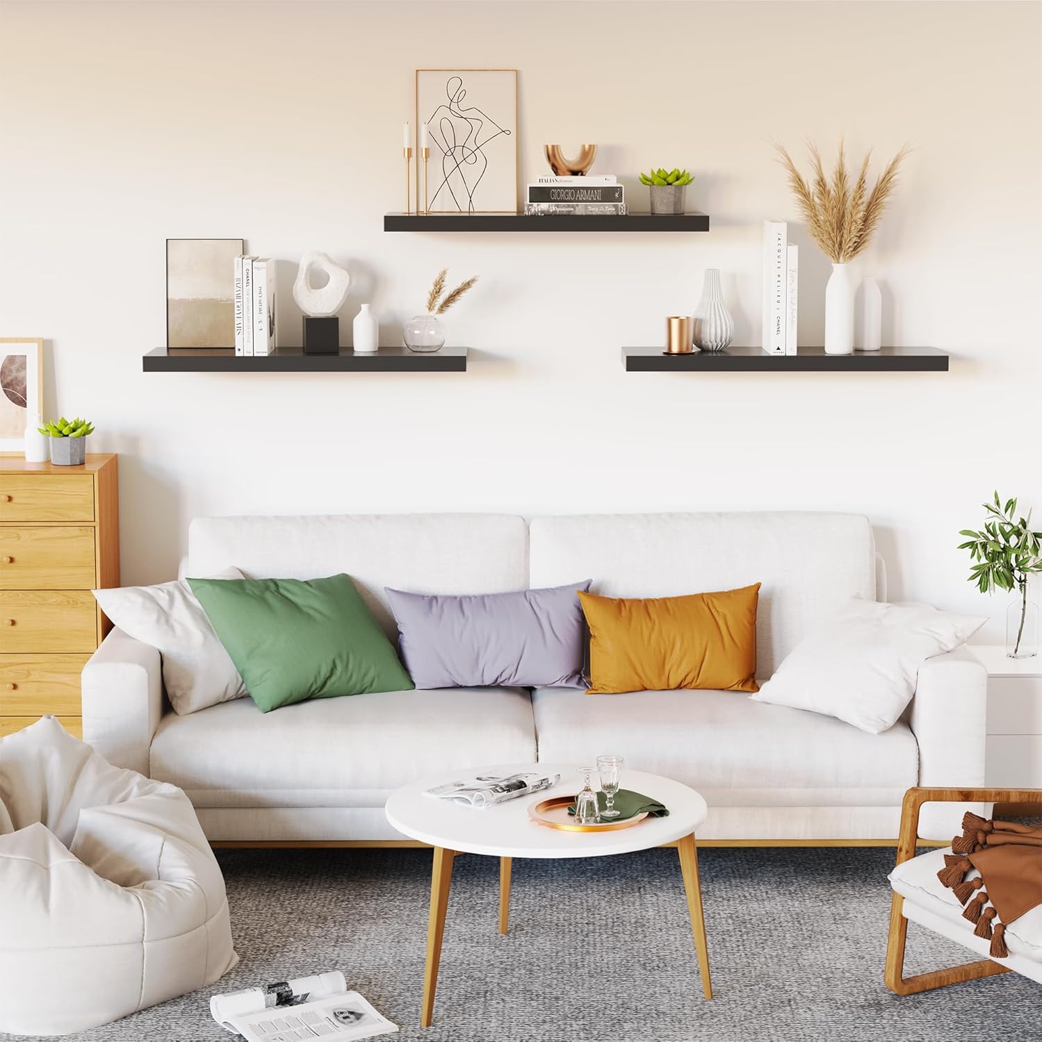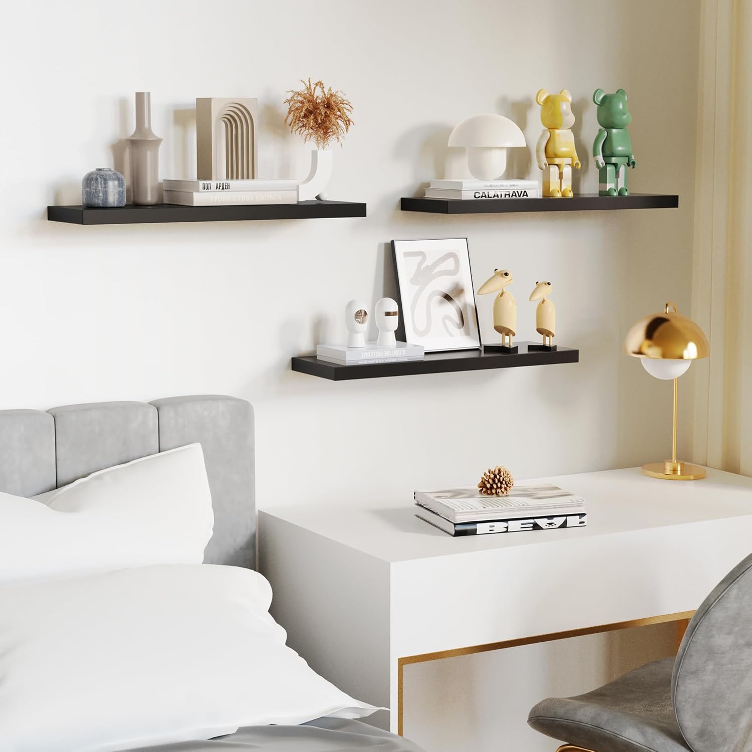 - 【Versatile & Functional】Our white floating shelves for wall can simplify our life which let everything will be in reach. Our wall shelf is a perfect space to display our family pictures, books, memorandums, charming antiques or artwork, spices or jars and fresh green plant. Our floating shelf wood not only give us extra storage but also improve the beauty of our home decor. Our white shelves can be perfectly integrated and decorated in the bathroom, kitchen, living room, bedroom and other place.