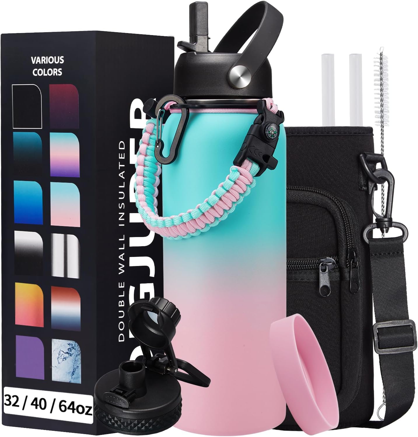 - COMBO—Super Deal: Buy 40oz stainless steel water bottles and get 9 accessories (2 x lids, 1 x survival paracord, 1 x carrying pouch, 1 x shoulder strap, 1 x protective cup mat, 2 x straws, 1 x straw brush). WITH A LIFETIME GUARANTEE, these thermal water bottles are the perfect gift for use at home, work, school, road trips, hiking, sporting events, or just hanging out
