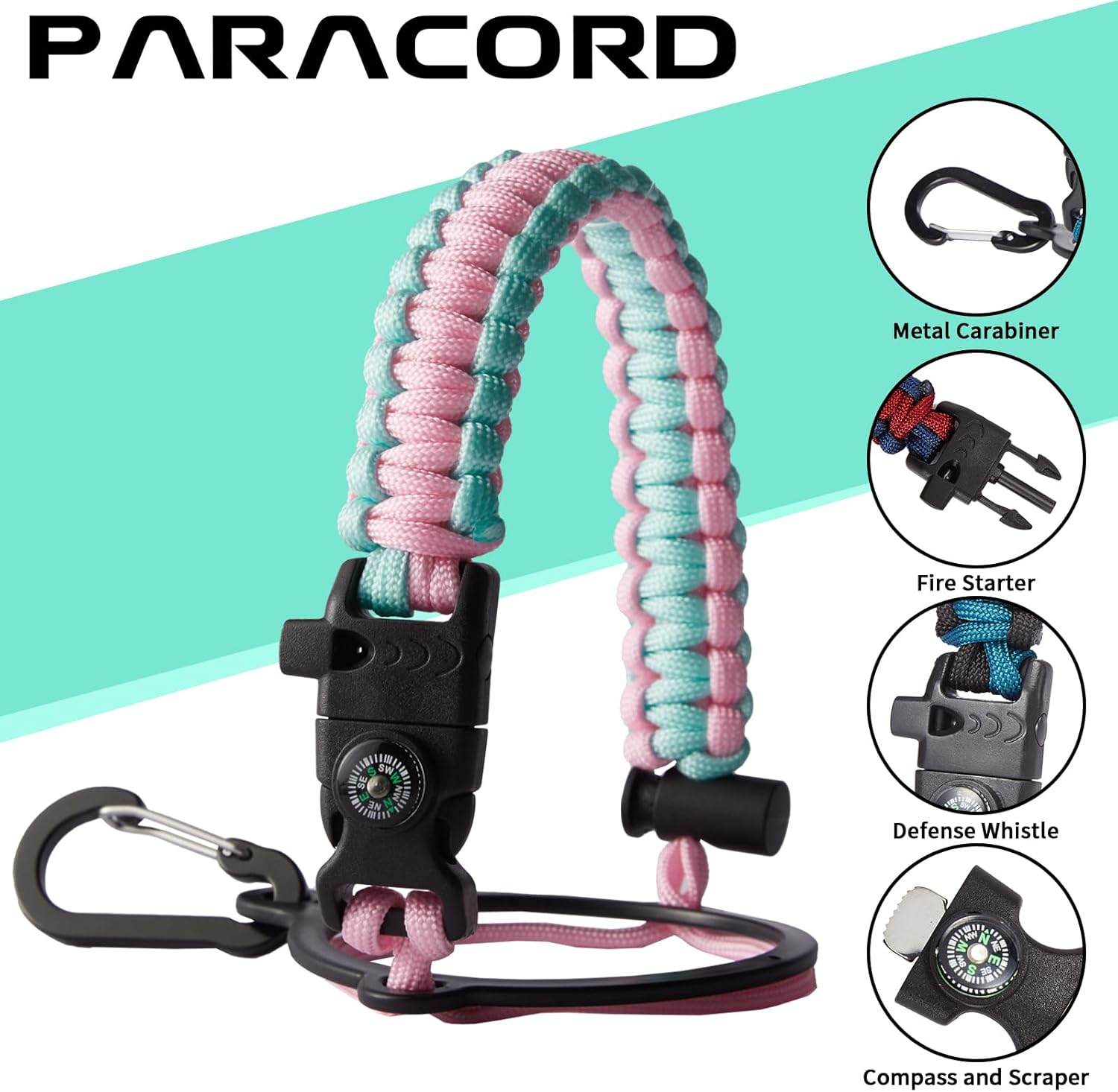 - UNIQUE PARACORD—Perfect Accessories: bright color paracord matches the flask water bottle to give you a youthful vibe while adding a personal style. It comes with a compass, safety loop, metal carabiner, flint, igniter, and whistle to become your survival tool for your wild adventures