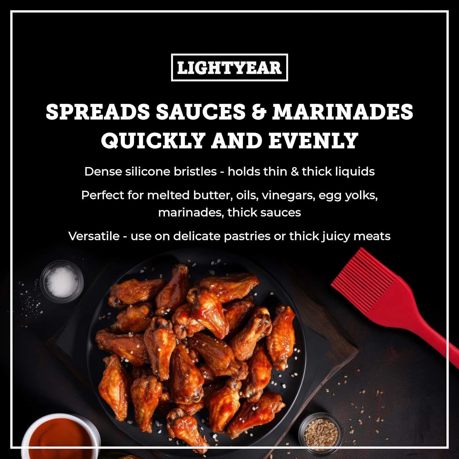 - [ SPREADS SAUCES AND MARINADES QUICKLY AND EVENLY ] Lightyear’s dense silicone bristles absorb both thick and thin liquids for more effective basting. This means you get an even spread of your marinade, ensuring that every inch of your food is infused with flavour. Perfect for melted butter, oils, vinegars, egg yolks, and juicy meat marinade.