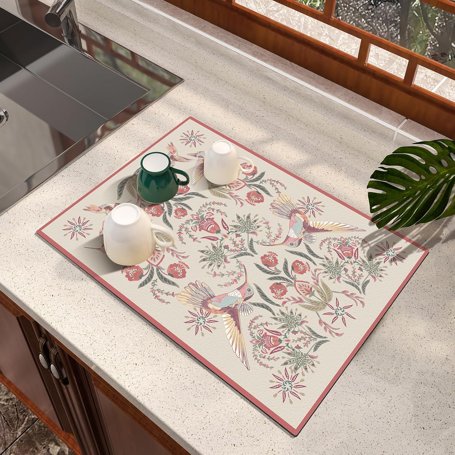 Dish Drying Mat, Absorbent Coffee Mat Rubber Backed, Soft Silicone Dish Drying Mat for Kitchen Counter or Sink for Kitchen Bathroom Coffee Bar (Birds and Flowers, 12 x 16 Inches)