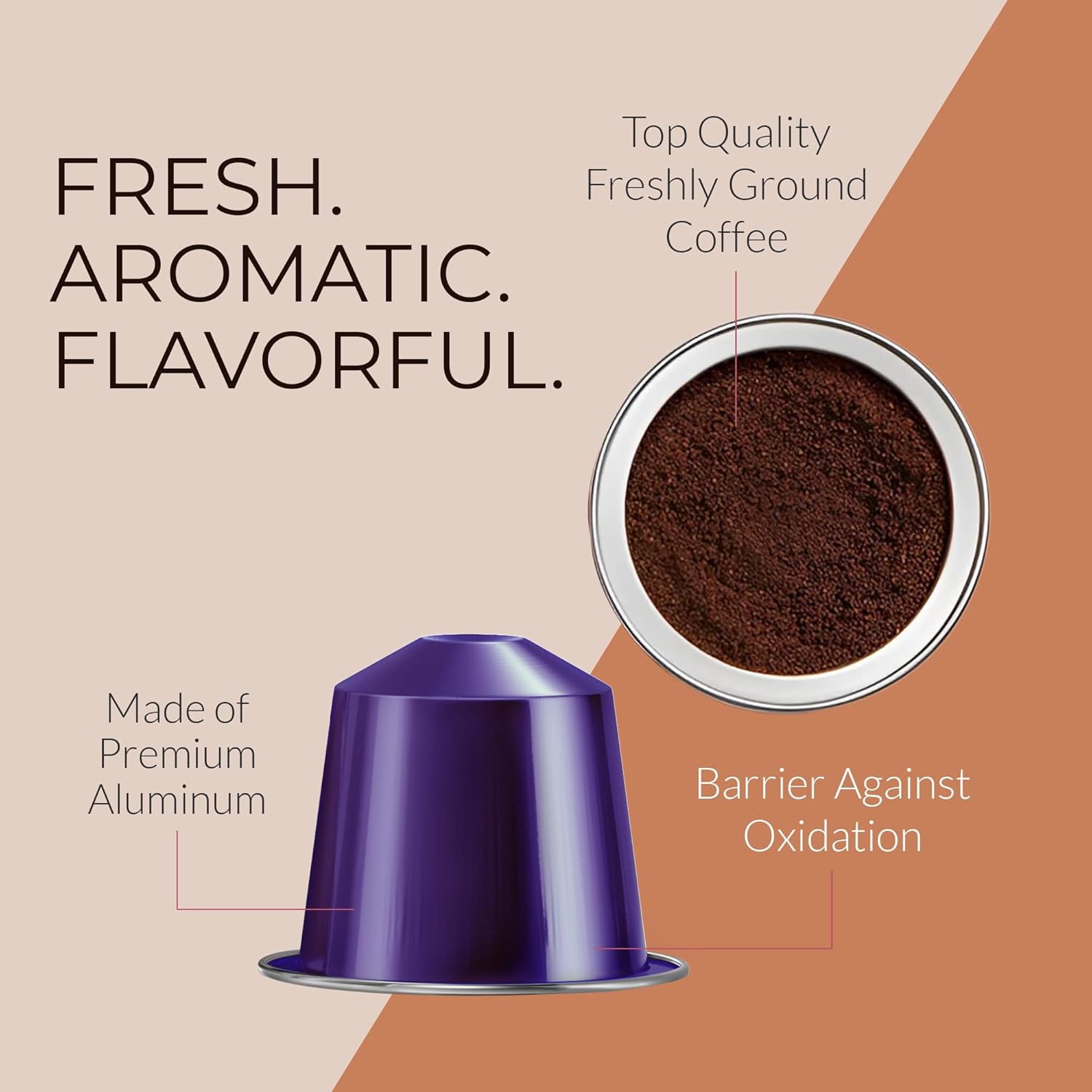 - Aluminum Espresso Capsules: Since our flavored coffee pods are aluminum, our espresso stays fresh, aromatic, and flavorful. It keeps our espresso coffee cups from oxidizing. So, you can enjoy our excellent coffee anytime, anywhere.