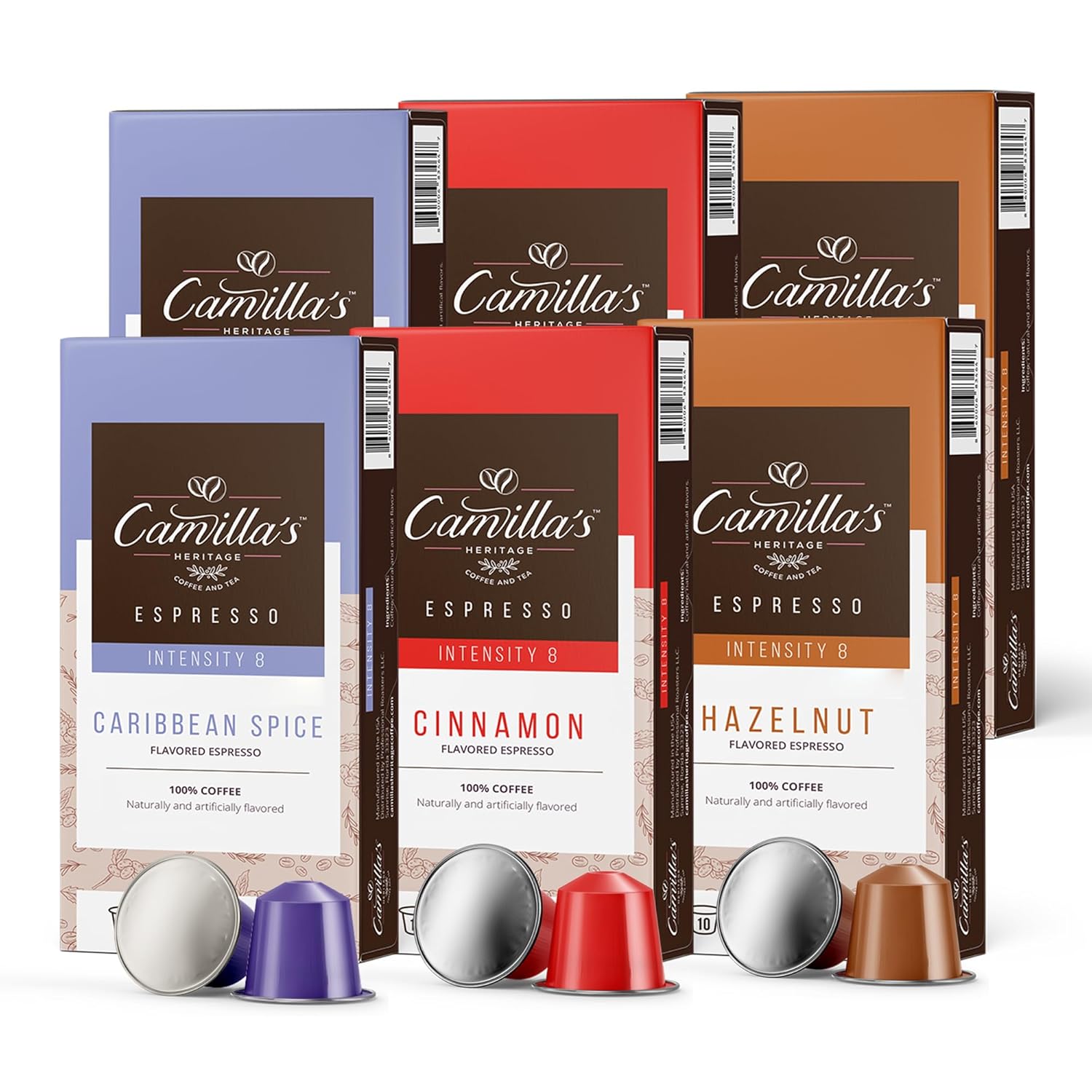 Camilla’s Heritage - Intensity 8 Flavored Espresso Coffee Spiced Variety Pack (Caribbean Spice, Cinnamon & Hazelnut Espresso Cups) 60 Coffee Pods