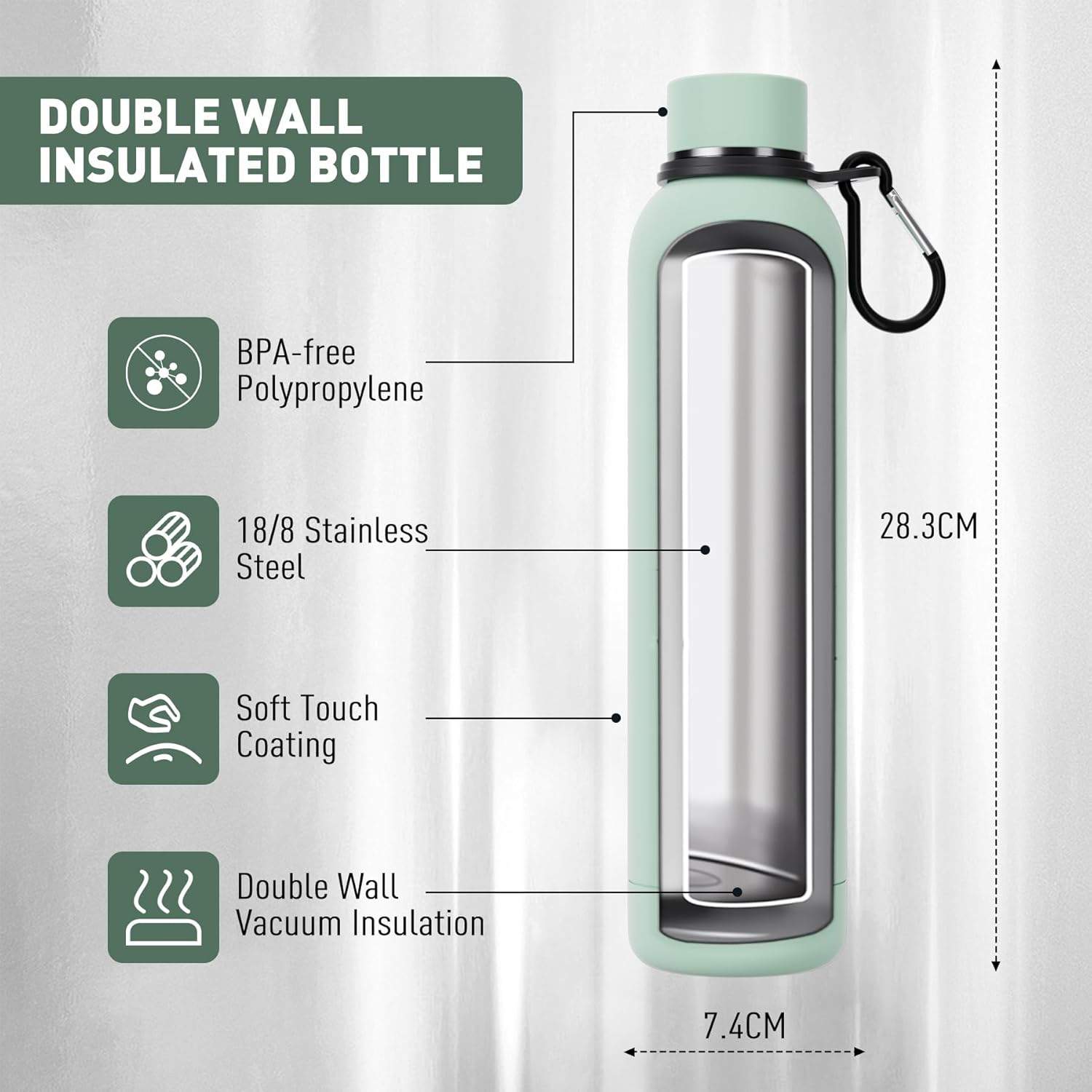 Slim Insulated Water Bottles for Travel 25oz with Clip, Double Wall Vacuum Stainless Steel Water Bottle Keeps Drinks Cold 24 Hrs/Hot 12 Hrs, 100% Leakproof, BPA Free(Mint)