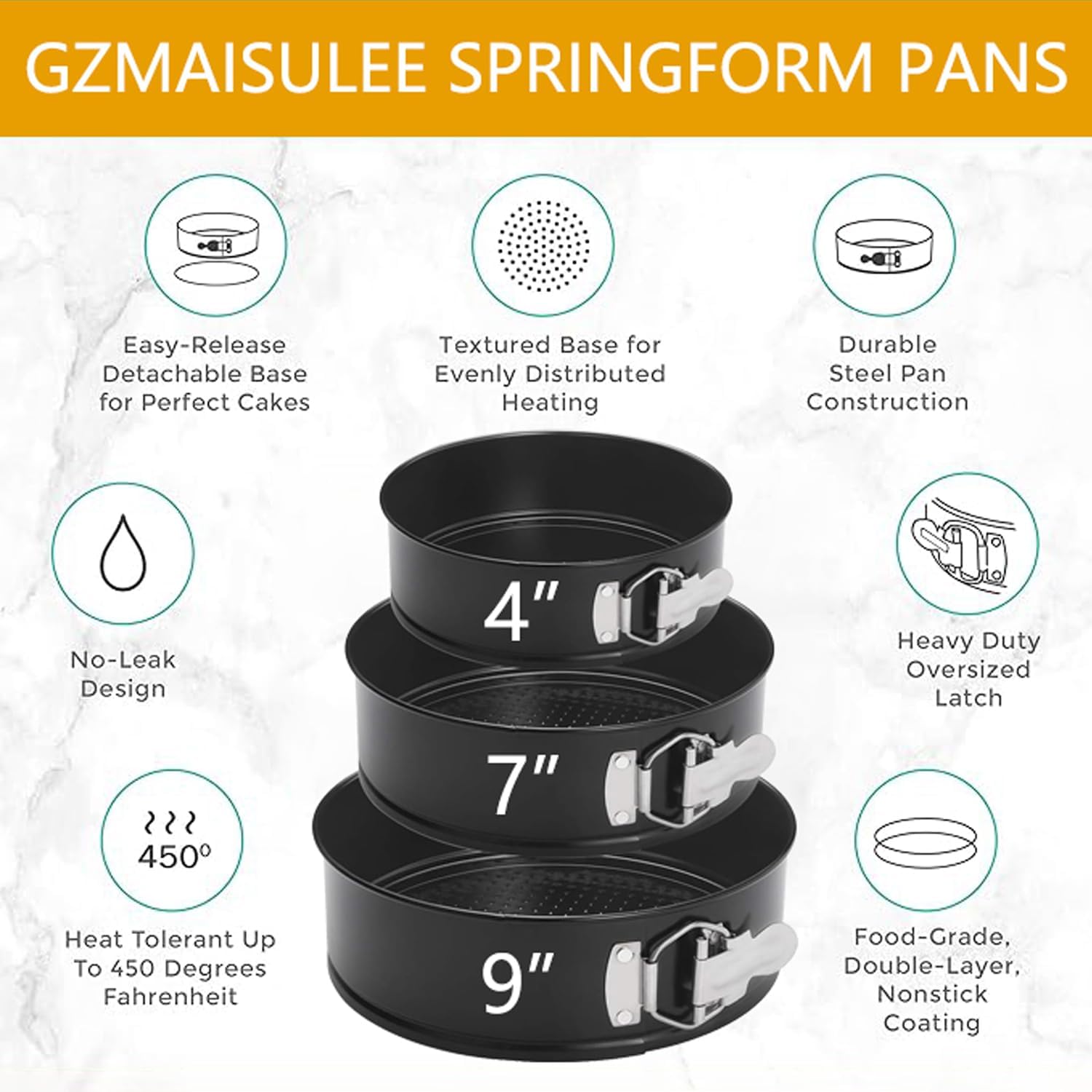 Springform Cake Pan Set of 3 (4, 7, 9 Inch) Round Leakproof Nonstick Cheesecake Pans with Removable Bottom Carbon Steel Bakeware