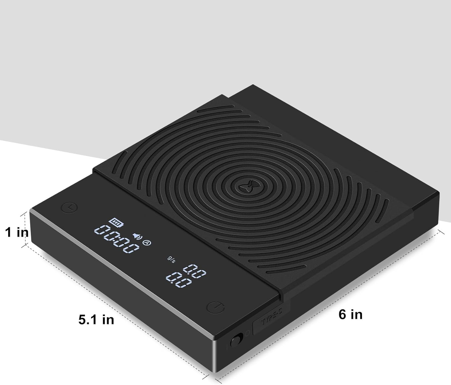 - AWESOME ACCURACY: Multifunction coffee scale equipped with high precision sensors and liquid Measurement technology, provide you accurate measurements from 0.1g up to 2kg(The initial minimum weight is 0.5G). Perfect for the volume of liquid measuring, home cooking, baking, and food portioning.
