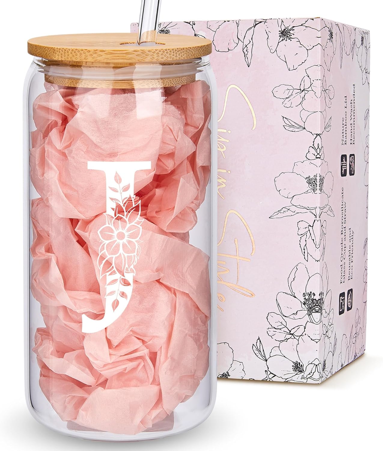 Personalized Gifts for Women, Monogrammed Glass Cups with Lids and Straws, Custom Tumbler, Cute Customized Mug, Aesthetic Stuff, Initial Iced Coffee Cup, Drinking Glasses, Birthday Teacher Gifts, J