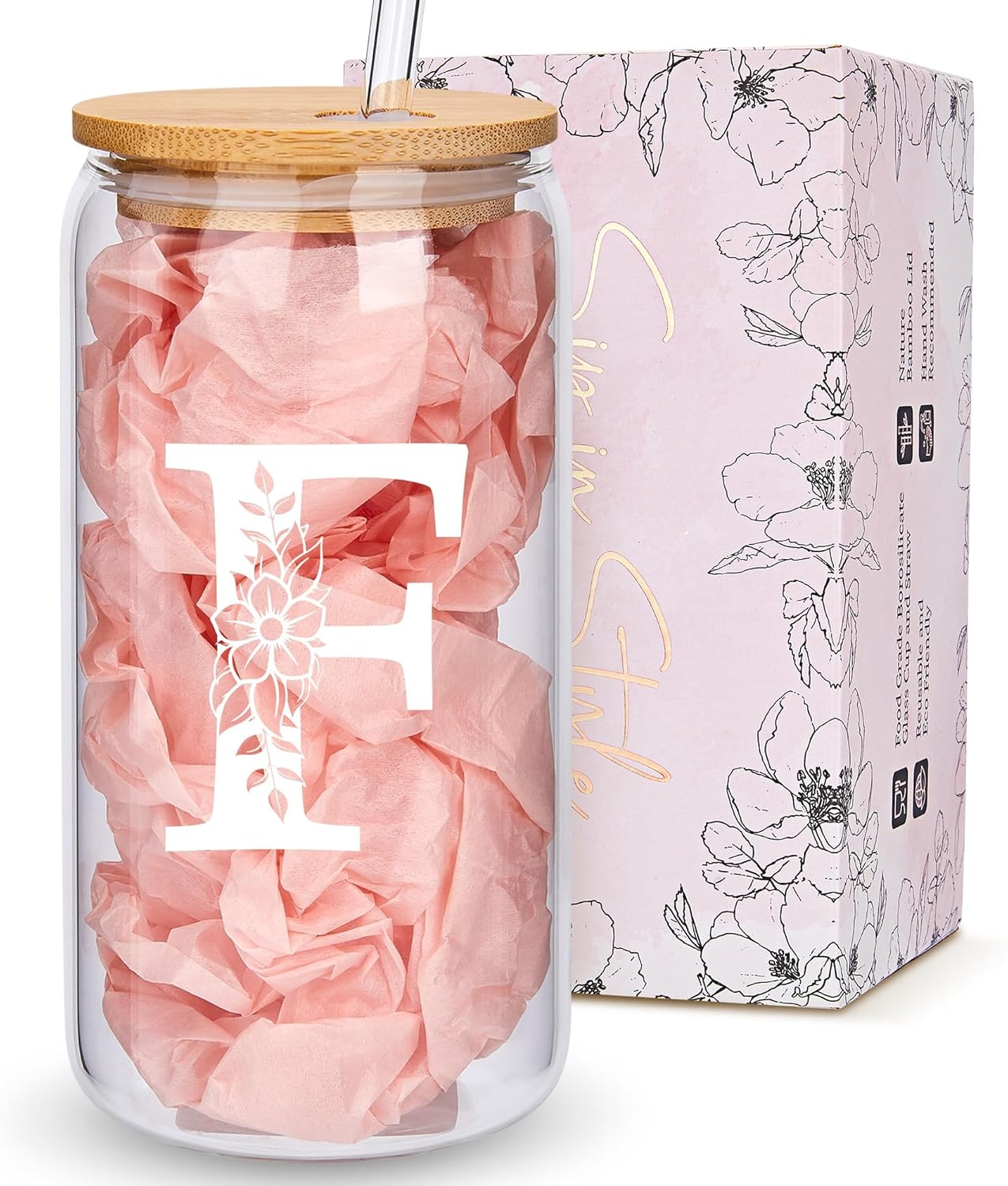 Personalized Gifts for Women, Monogrammed Glass Cups with Lids and Straws, Custom Tumbler, Cute Customized Mug, Aesthetic Stuff, Initial Iced Coffee Cup, Drinking Glasses, Birthday Teacher Gifts, F