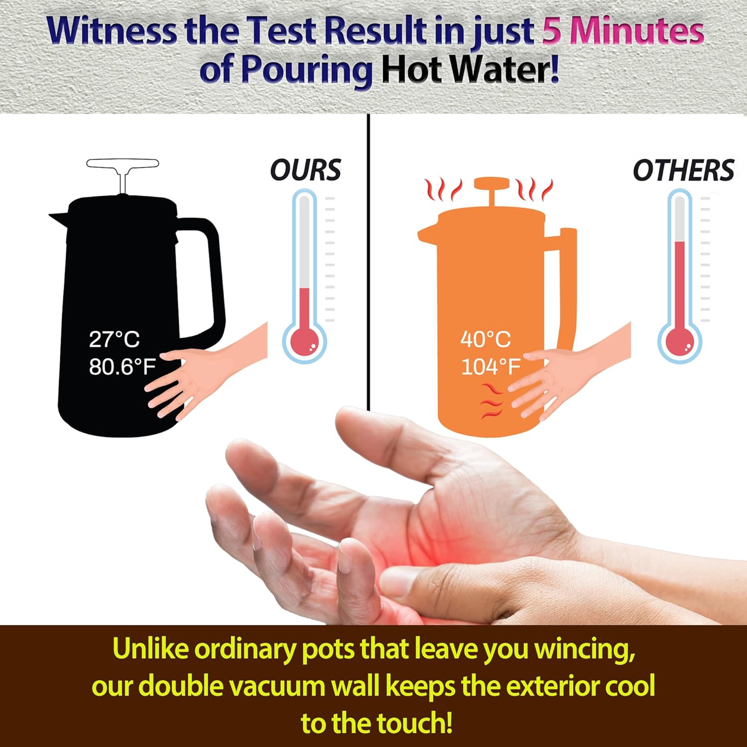 - Long-lasting Heat: Our French press features a complete vacuum insulation that keeps your coffee hot for hours. Even after a 3-hour wait, the coffee remains steaming at the perfect temperature.