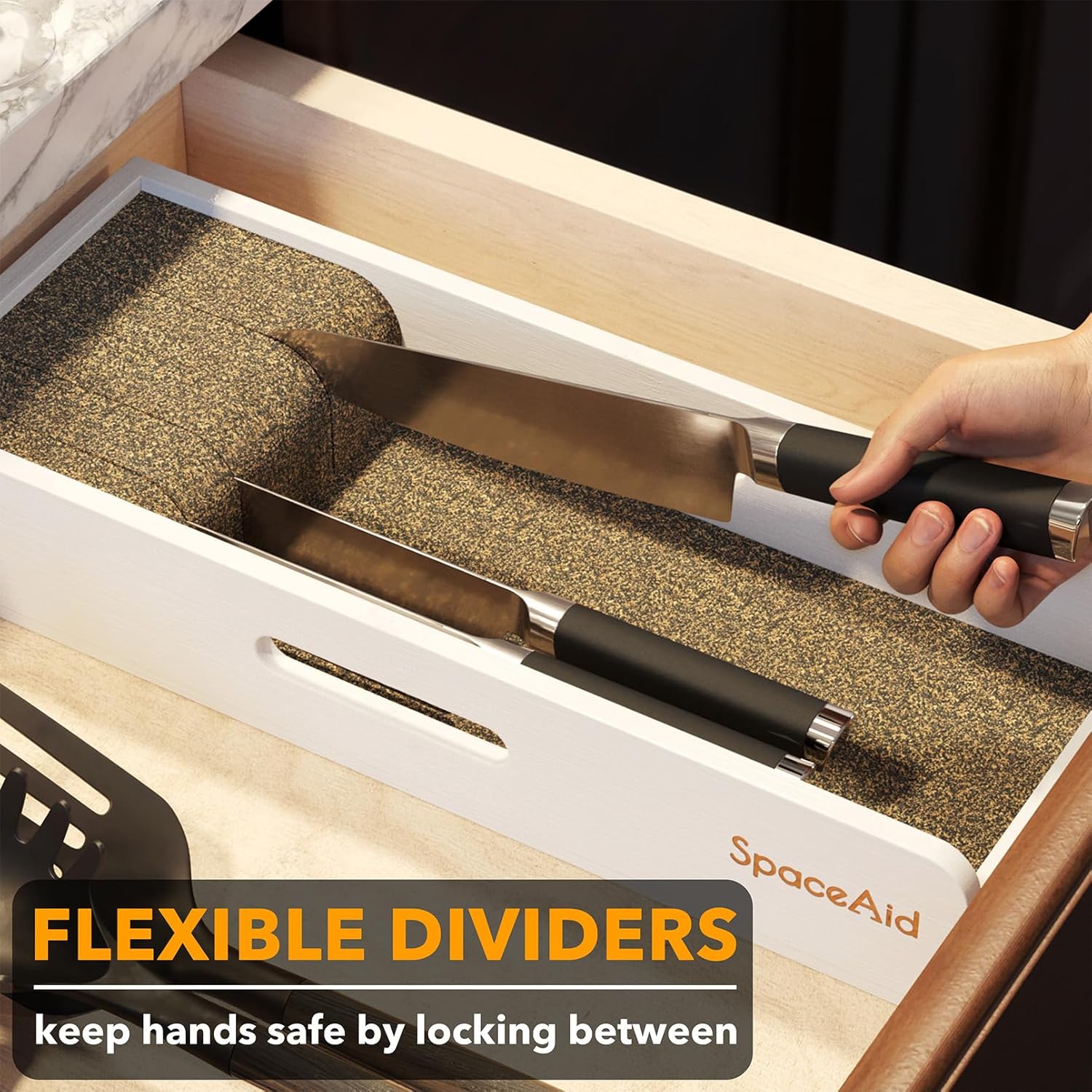 - FLEXIBLE DIVIDERS - Made from cork and rubber composite, this in drawer knives drawer organizer holds knives up to 12" long in place for storage; SIZE: 15"L x 5.9"W x 2.5"H