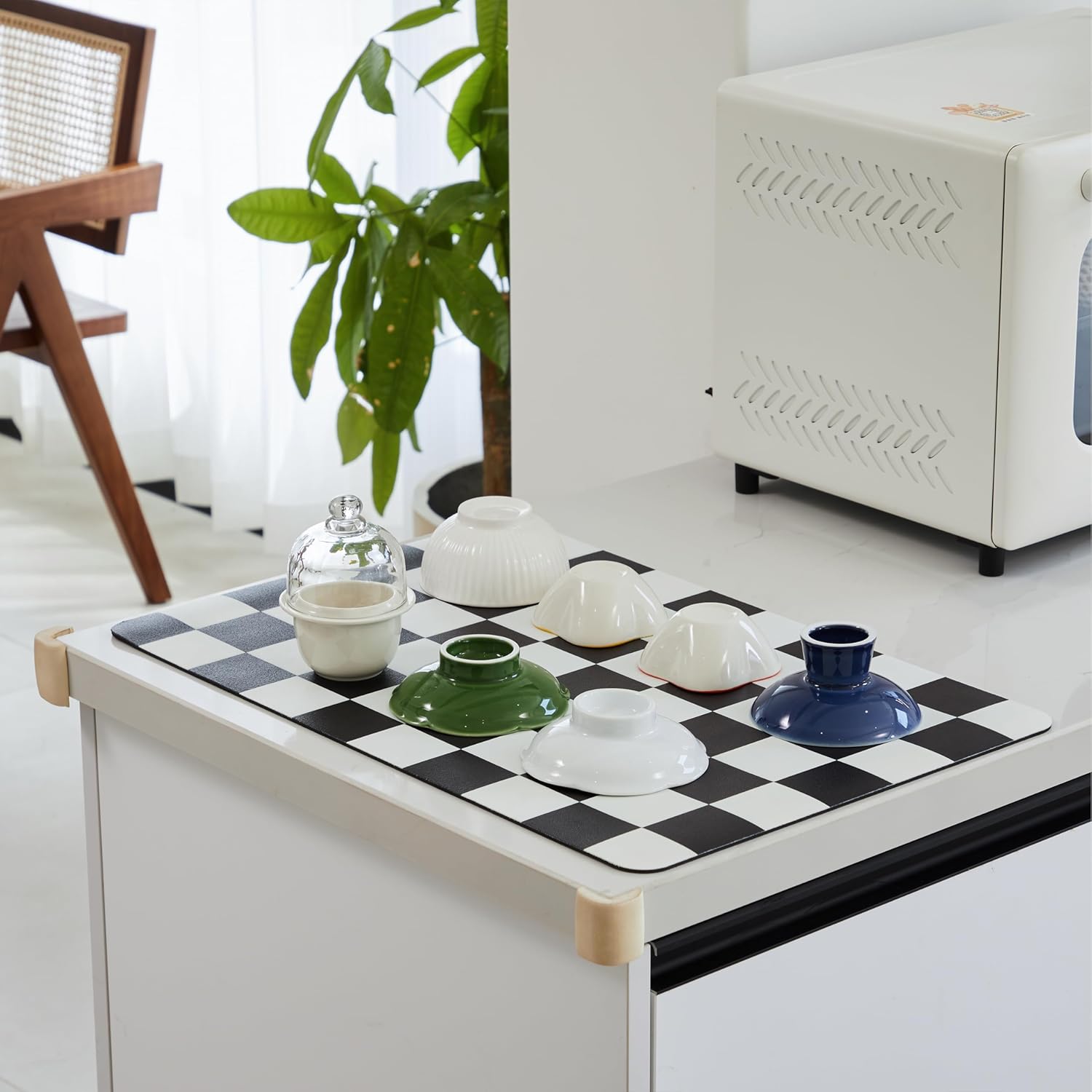 - Colorful Checkered Design: Our dish mat comes in four vibrant checkered designs, adding a pop of color and aesthetic to your kitchen counter and coffee bar. With two size options available, you can choose the perfect fit for your space.