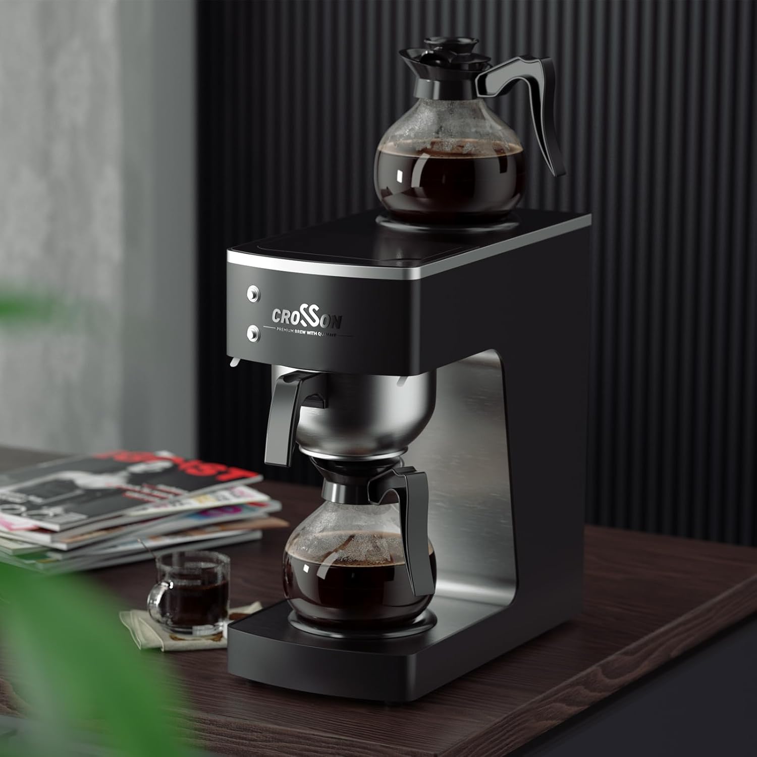 crosson 12 Cup Commercial Drip Coffee Brewer with Upper and Lower Warmer & 2 Glass Decanter,Pour Over Coffee Maker with Easy Clean Fingerprint Free Housing and 304 Stainless Steel Funnel