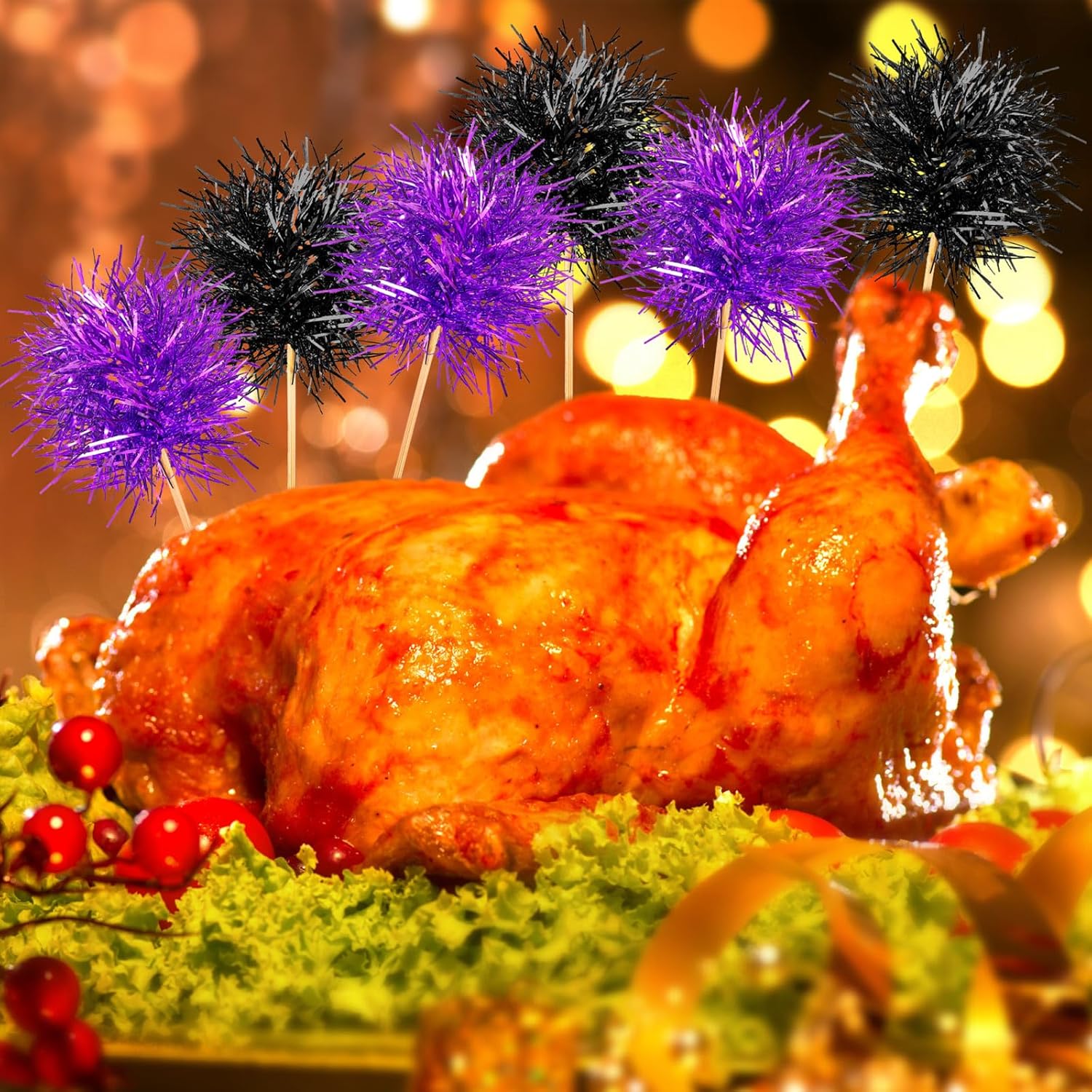 Chinco 100 Pcs Foil Firework Cupcake Toppers Sparkle Tinsel Cake Toppers Cake Decoration Cocktail Fruit Toothpick for Birthday Wedding Graduation Party(Purple, Black)